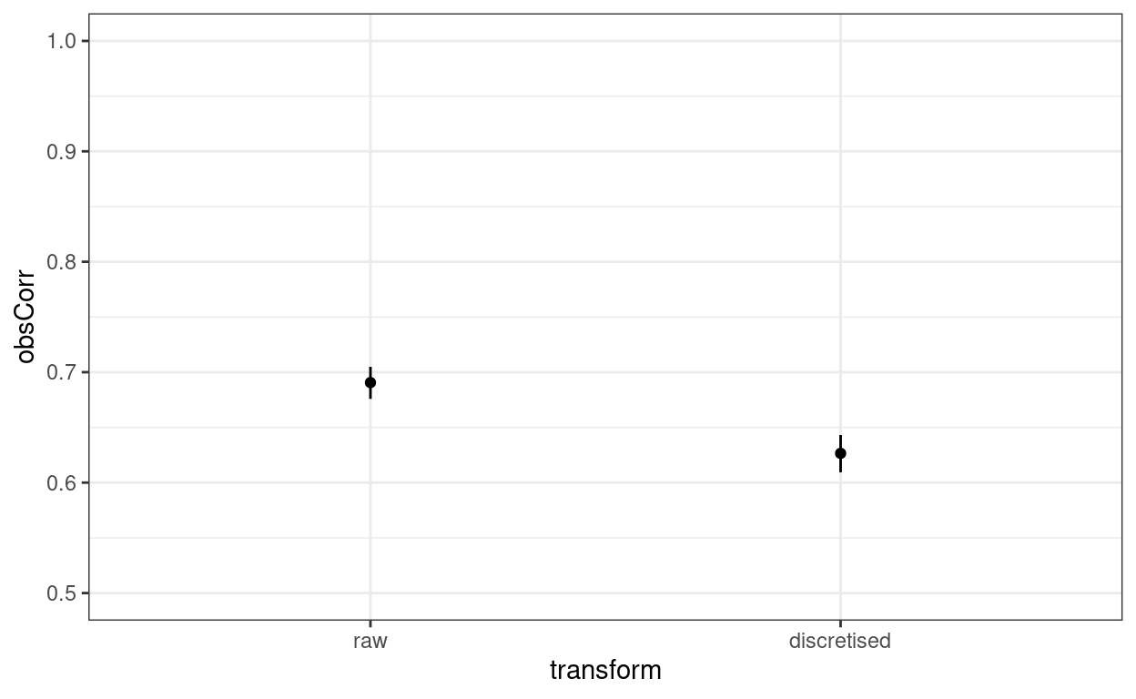 The correlation between the original variables is 0.691 with parametric 95% confidence interval (CI) from 0.676 to 0.705 whereas that between the discretised variables is 0.626 with 95% CI from 0.609 to 0.643 so some clear attenuation there. Micro forest plot of that: