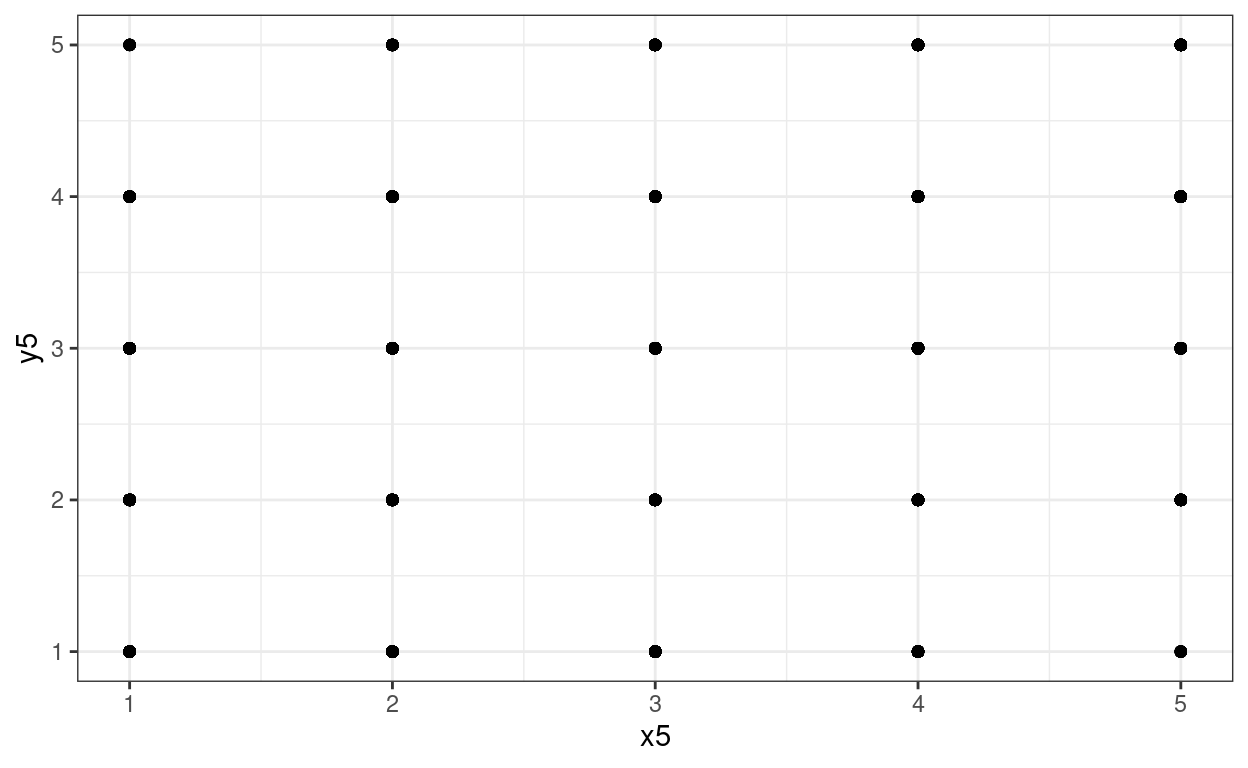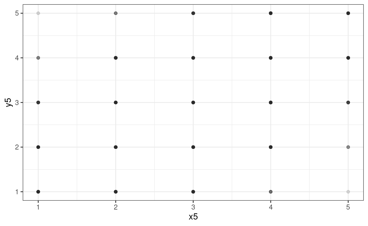 Whoops: much overprinting as 5000 points have collapsed to 25 visible points on the scattergram but we can’t see how much and no apparent relationship between the variables at all.