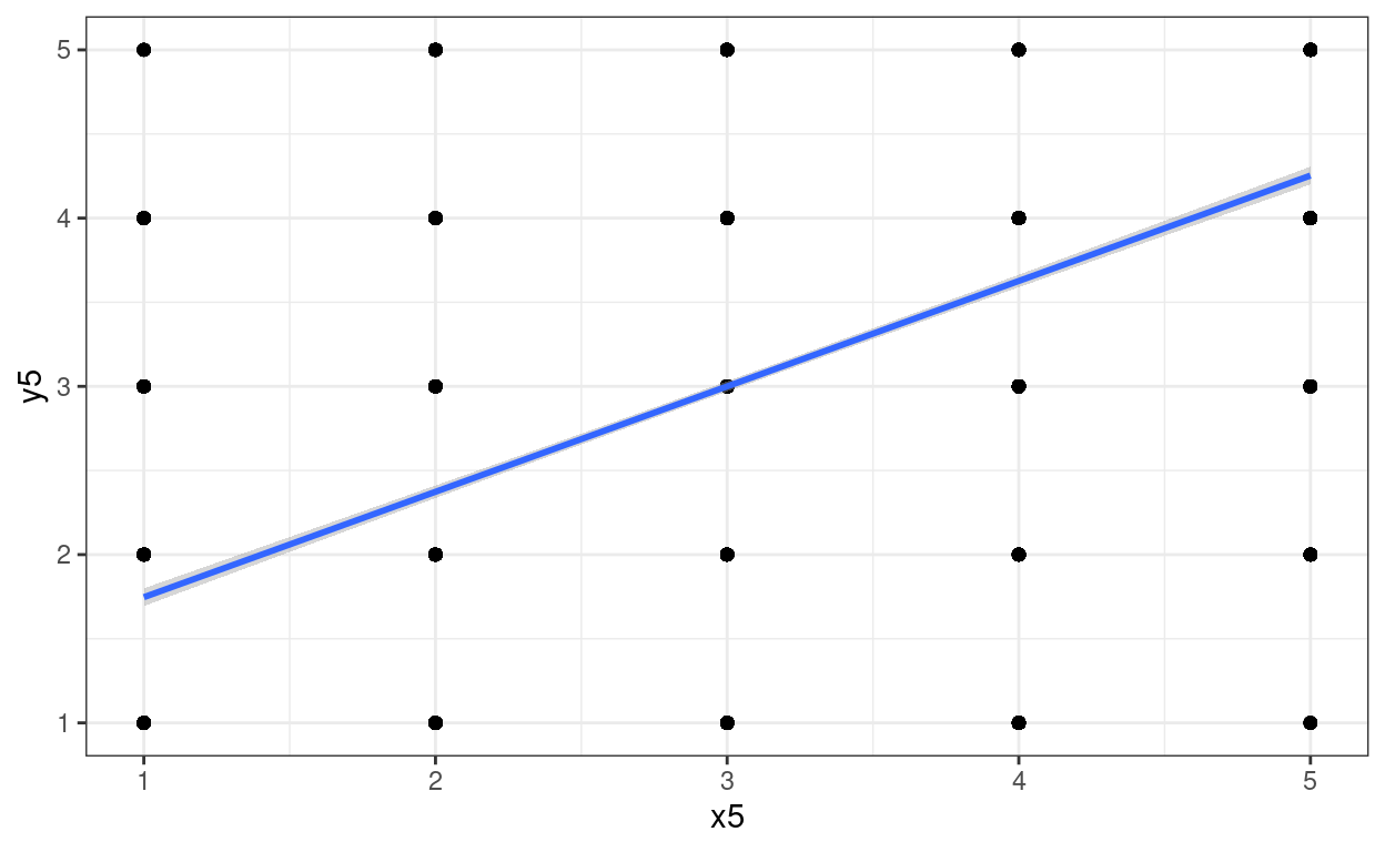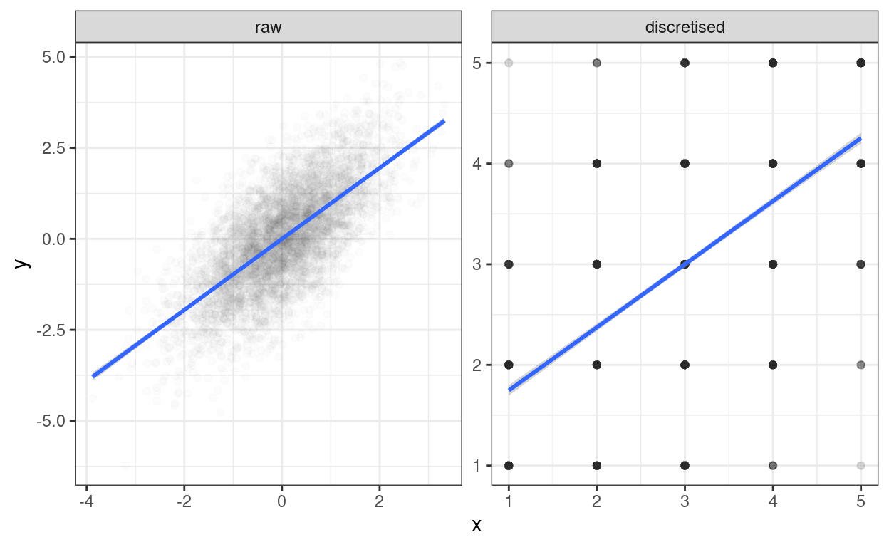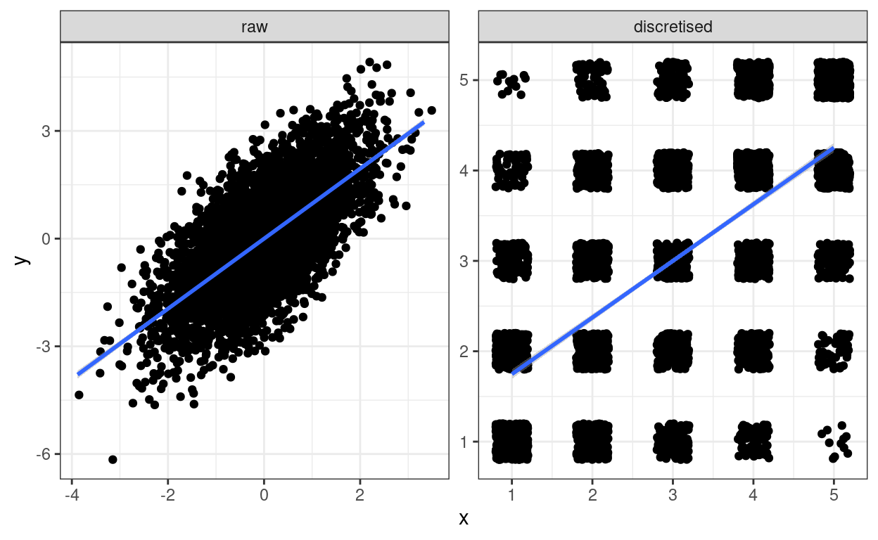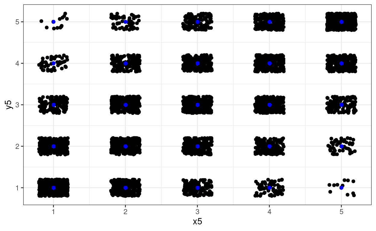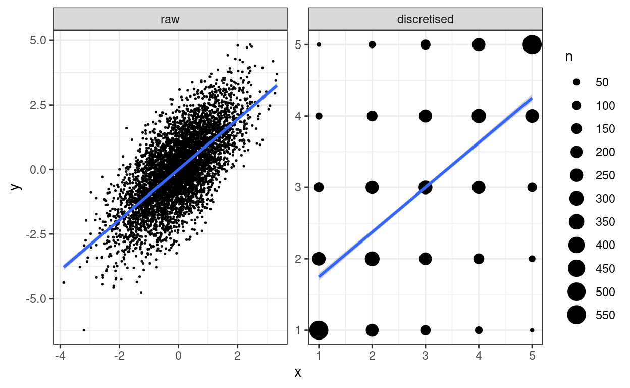 However, to really drive home the point about overprinting, if those points are transformed and discretised to five equiprobable scores then things look like this.