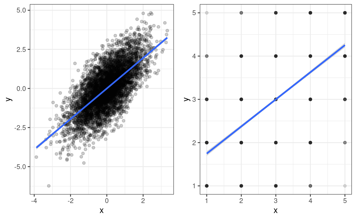 One way around overprinting it is to jitter the points. Here I have used geom_jitter(width = .2, height = .2) which adds random “jittering” to both x and y values spread across .2 of the “implied bins”. I’ve left the raw data in in blue.