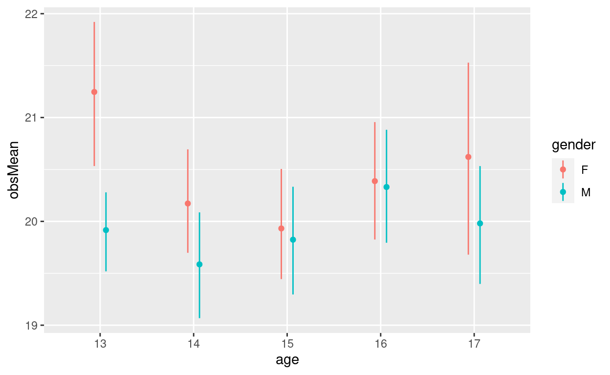 aes(x = age, y = obsMean, colour = gender, group = gender)) + # key thing is that dodging is by the grouping