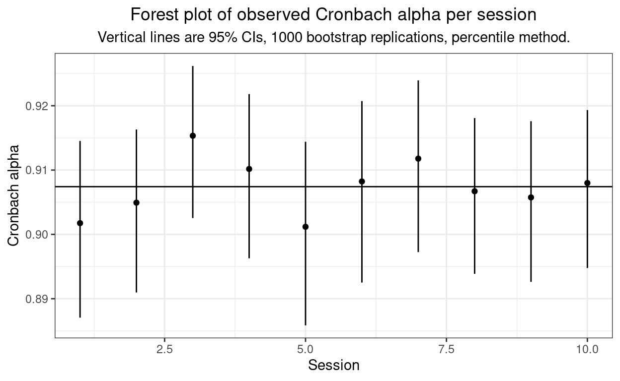 Well, as you’d expect from the simulation method, no evidence of heterogeneity of Cronbach’s alpha across sessions!