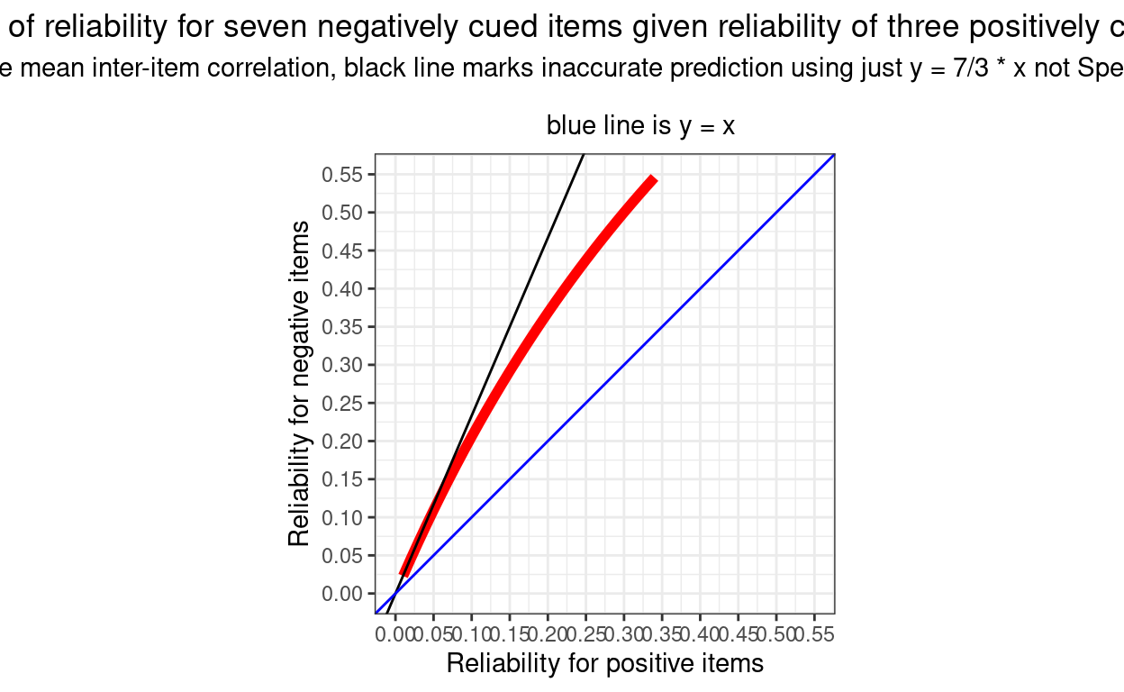We can see that the values are always well above equality to the reliability of the three items (the blue line) and we can see that the relationship isn’t a simple proportion and that the values are always lower than 7/3 times the reliability from the positively cued items.