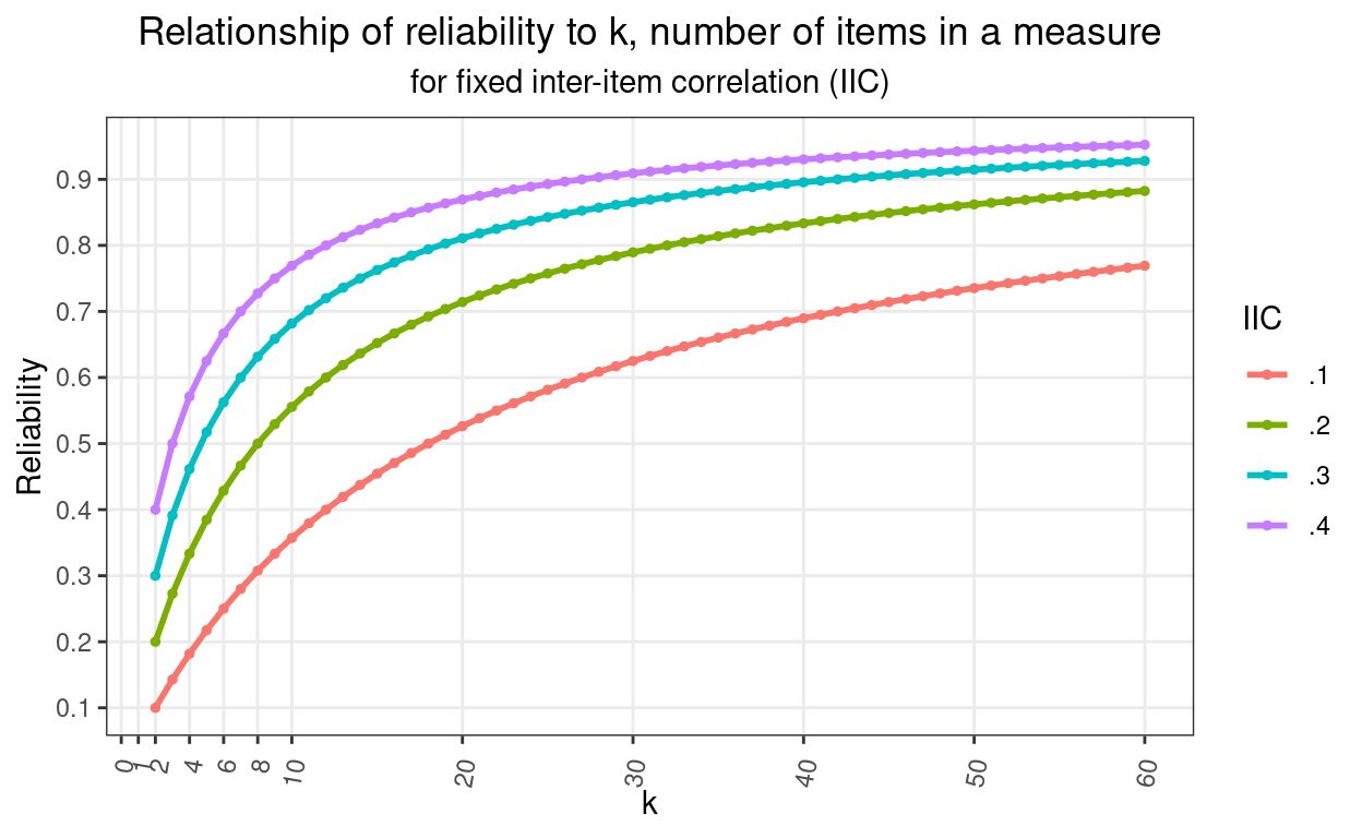 ggtitle("Relationship of reliability to k, number of items in a measure",