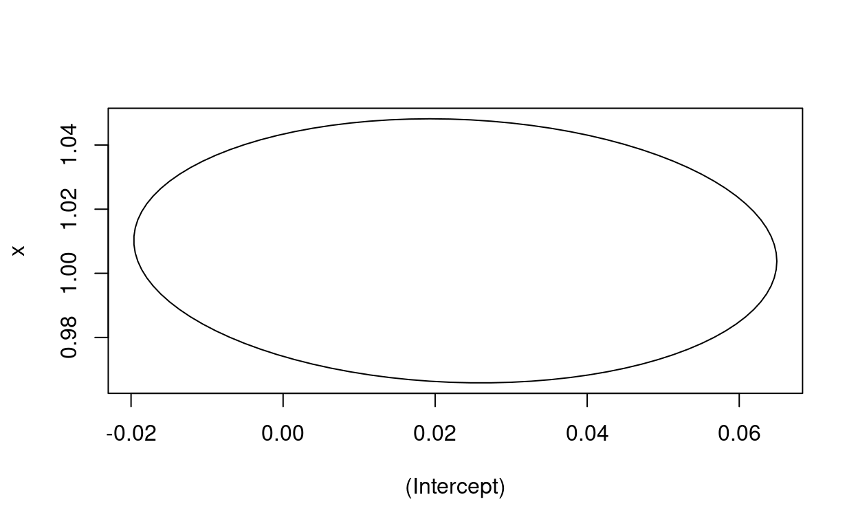 The two parameters are the intercept and the slope and the confidence ellipse shows the area containing the desired joint CIs. The default interval is 95% and here it is constructed using car::confidenceEllipse(). The point in the middle marks the point estimates of intercept and slope and the ellipse the CI around that.