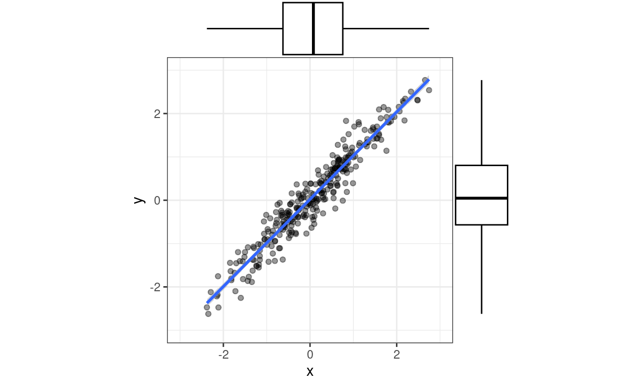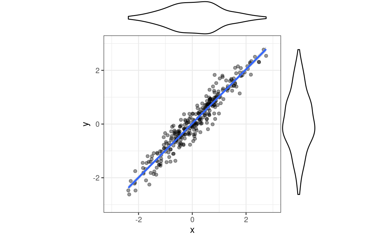 This is just so I remember where to find this and for the fun of it: ggExtra::ggMarginal() can add marginal histograms, density plots, boxplots, violin plots or “densigrams”, a combination of a histogram and a density plot, to the sides of a scattergram. I like this!