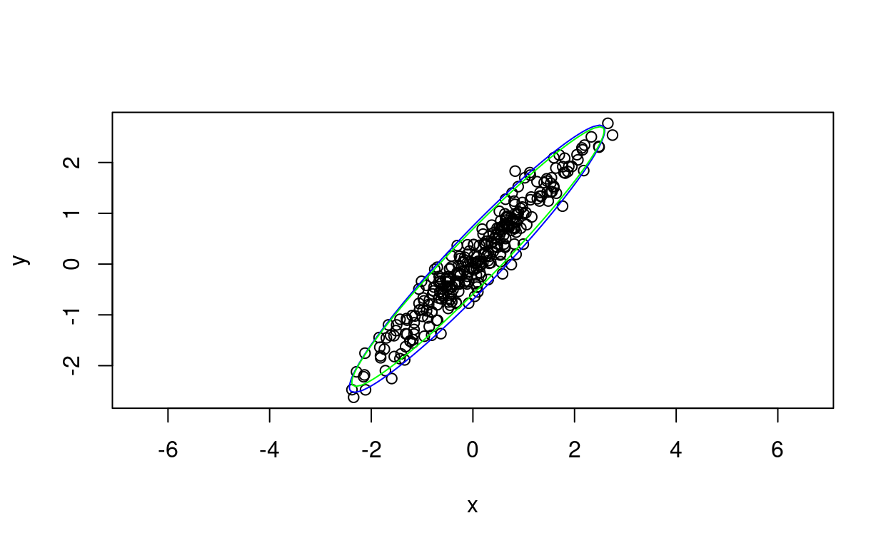 That has the 95% ellipse from the robust covariance matrix in green and the simple least squares ellipse in blue. As you would expect the difference is negligible as these are bivariate Gaussian data so there are few real outliers.