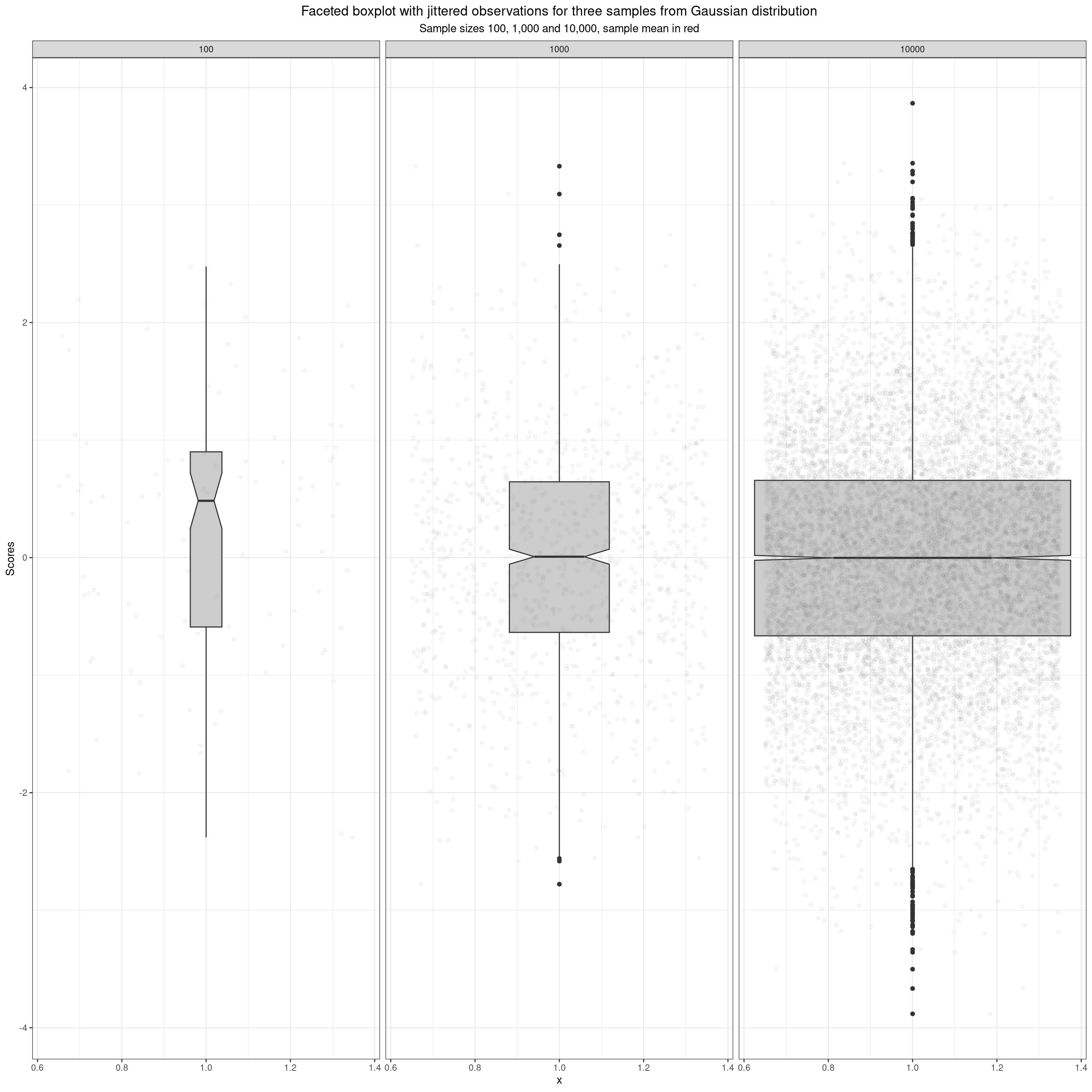 ggtitle("Faceted boxplot with jittered observations for three samples from Gaussian distribution",