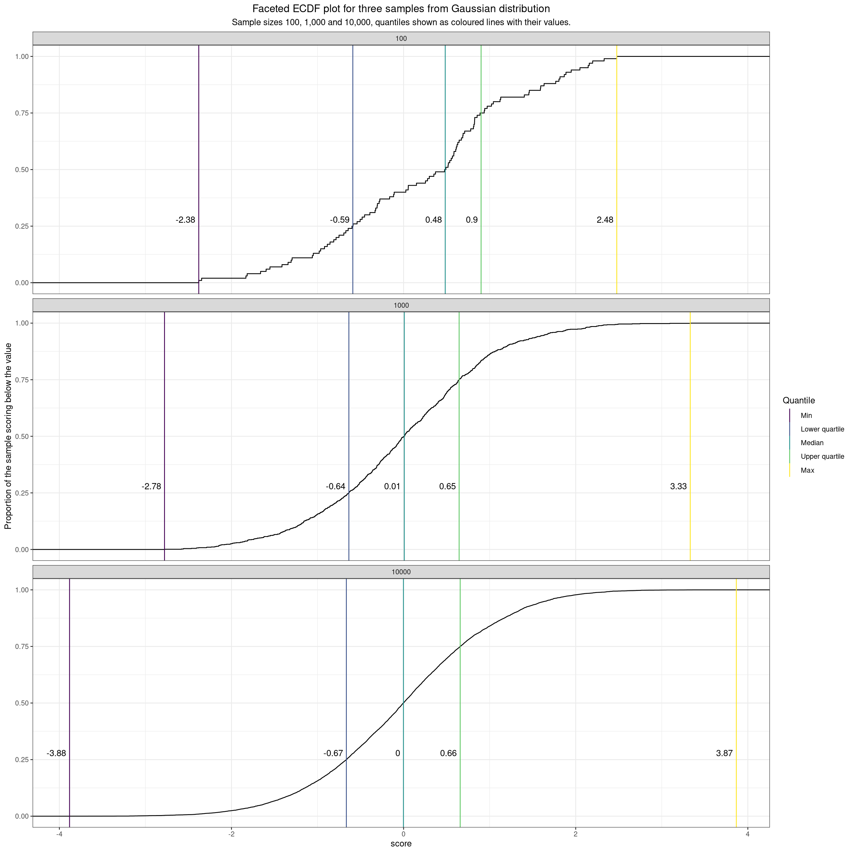 Quantiles tell us about the location of observed values within a distribution of data. Let’s start with: the Gaussian distribution (often called, but a bit misleadingly, the “Normal”. Note the capital letter: it’s not normal in any normal sense of that word!) This facetted plot shows three simulated samples from the Gaussian distribution. The sample sizes are 100, 1,000 and 10,000.