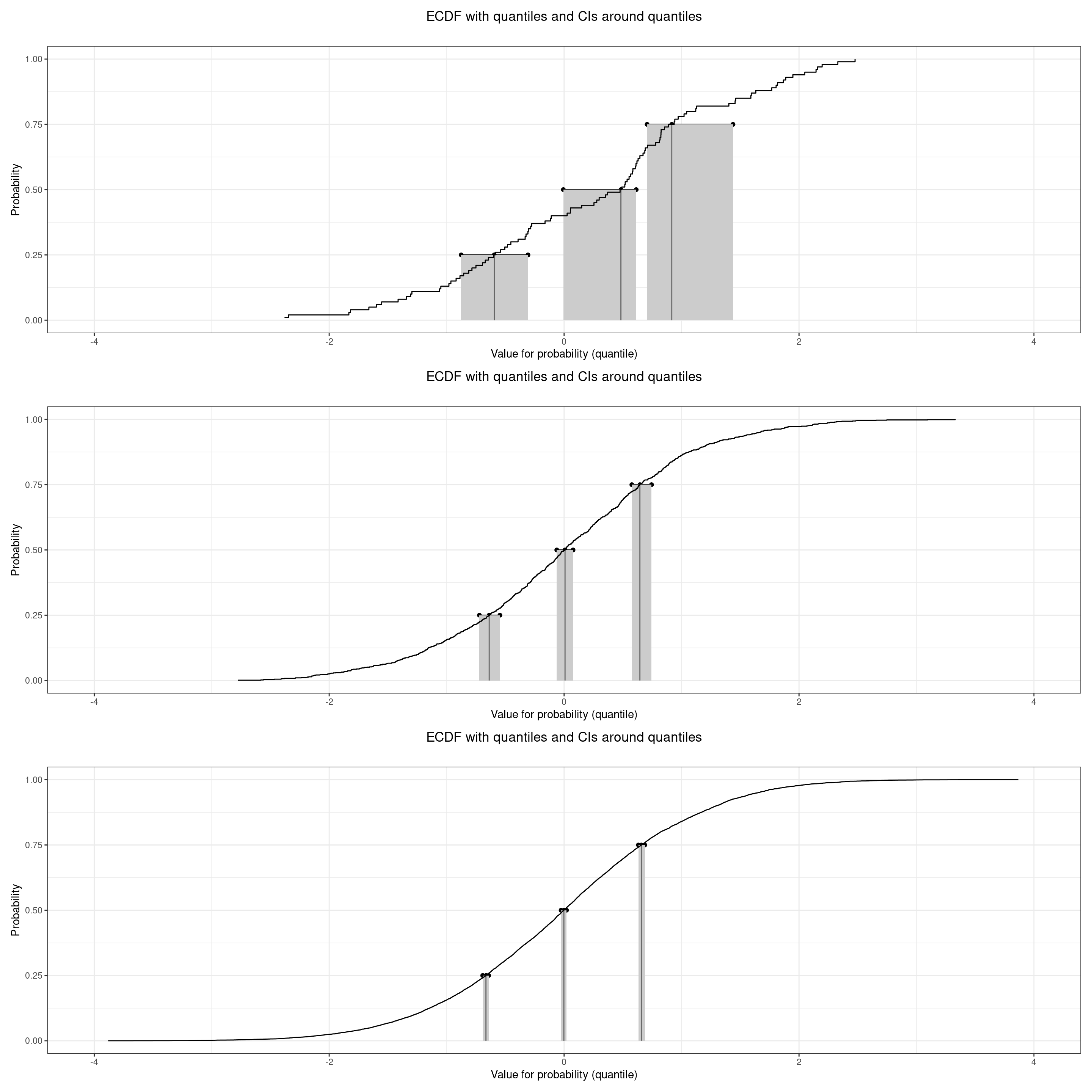 A general coverage of quantiles, the ECDF (Empirical Cumulative Distribution Function) and confidence intervals (CIs) around quantiles