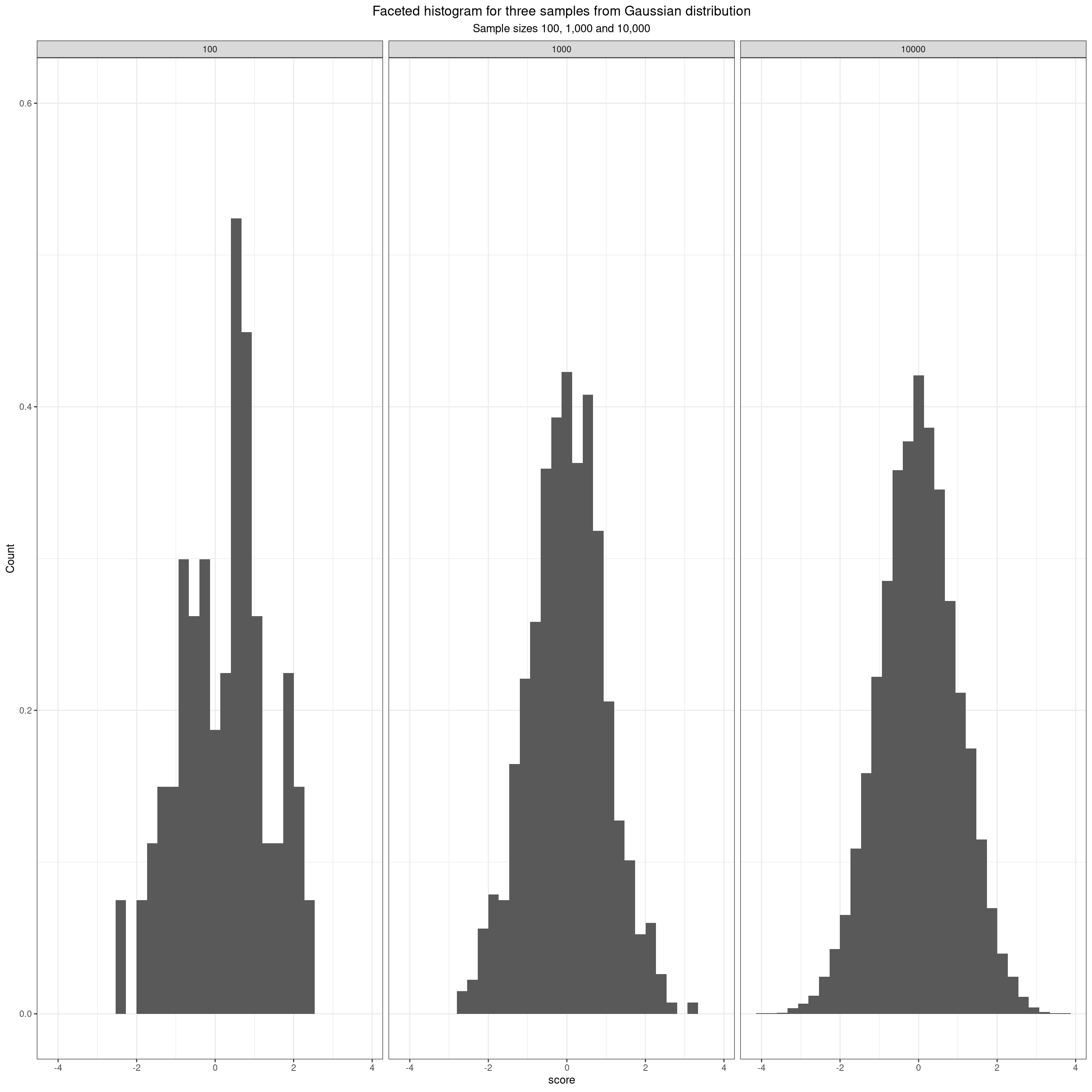 ggtitle("Faceted histogram for three samples from Gaussian distribution",