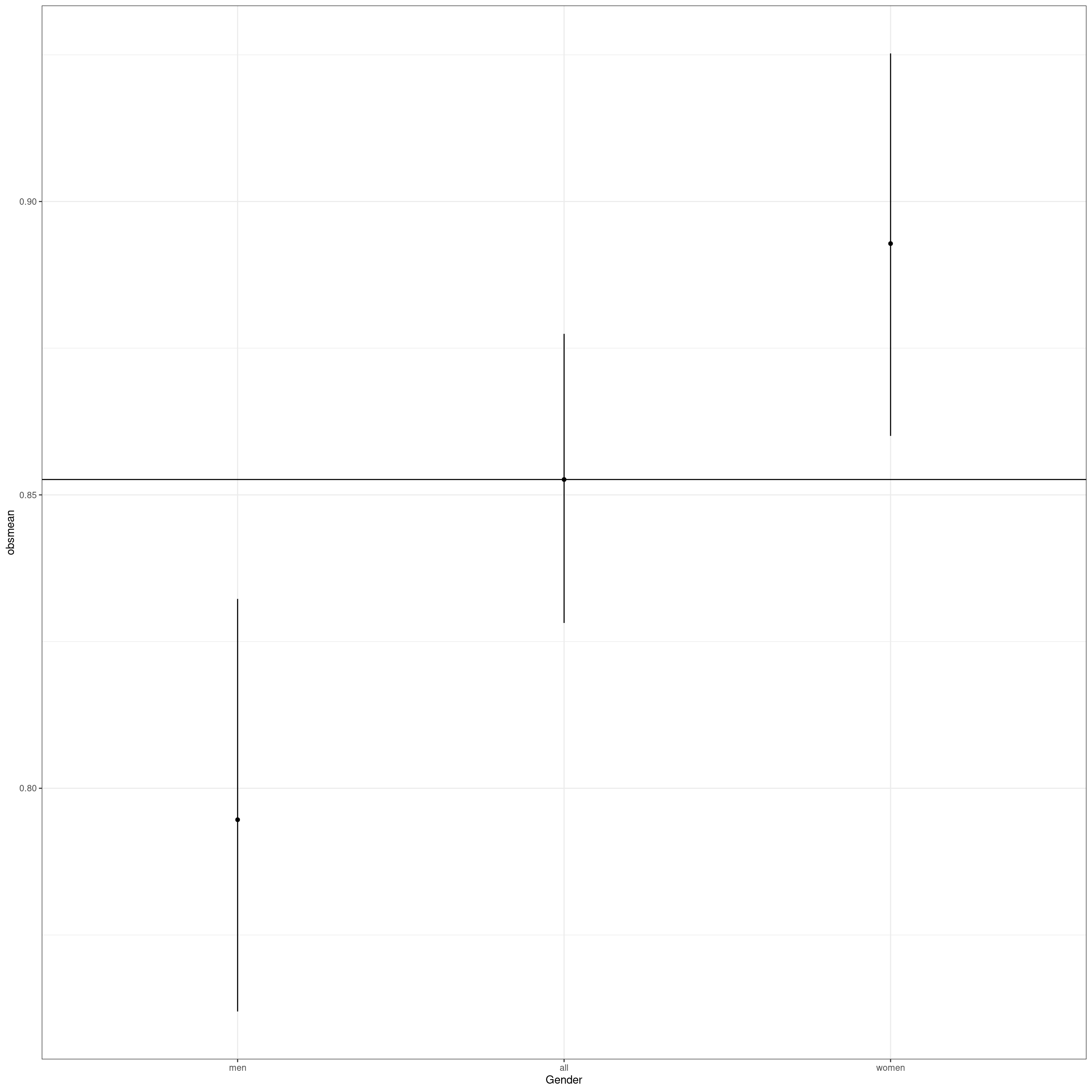 Going to plots as I always like to, here’s a forest type plot of the means and 95% CIs. Suggests a very impressive gender effect.