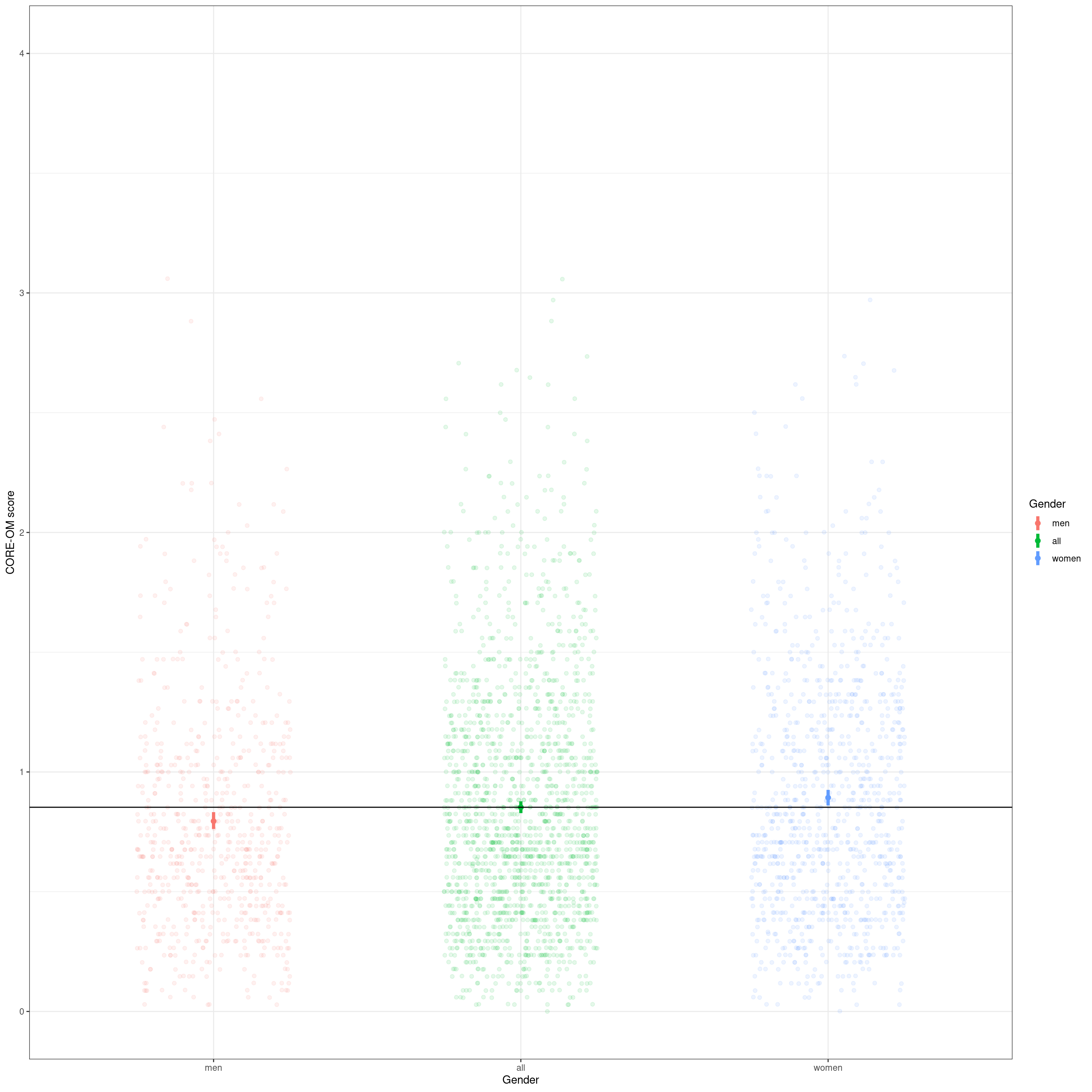 Of course when we put it in the context of the full range of possible CORE-OM scores and jitter the actual scores underneath the means and their CIs it’s less impressive.