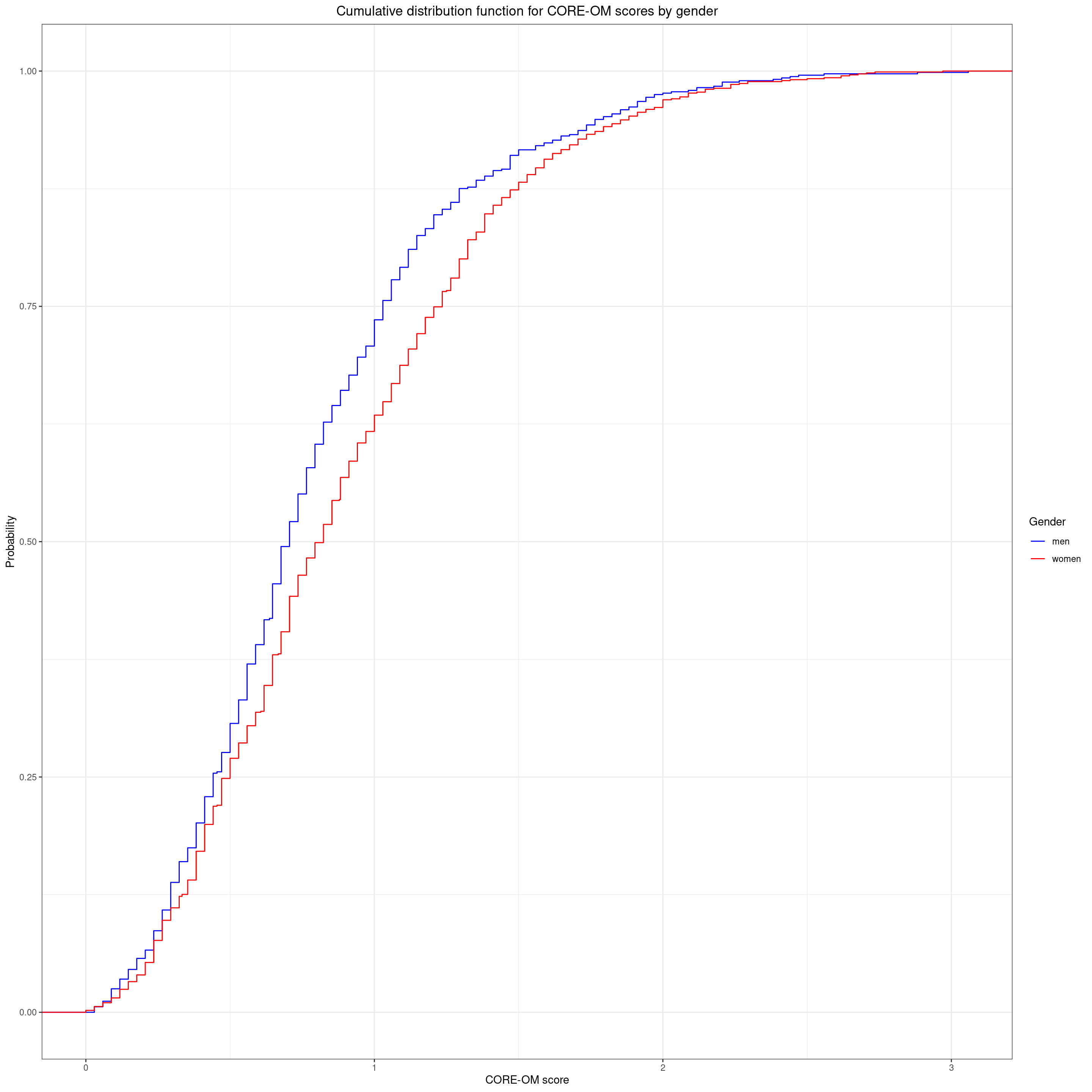 ggtitle("Cumulative distribution function for CORE-OM scores by gender")