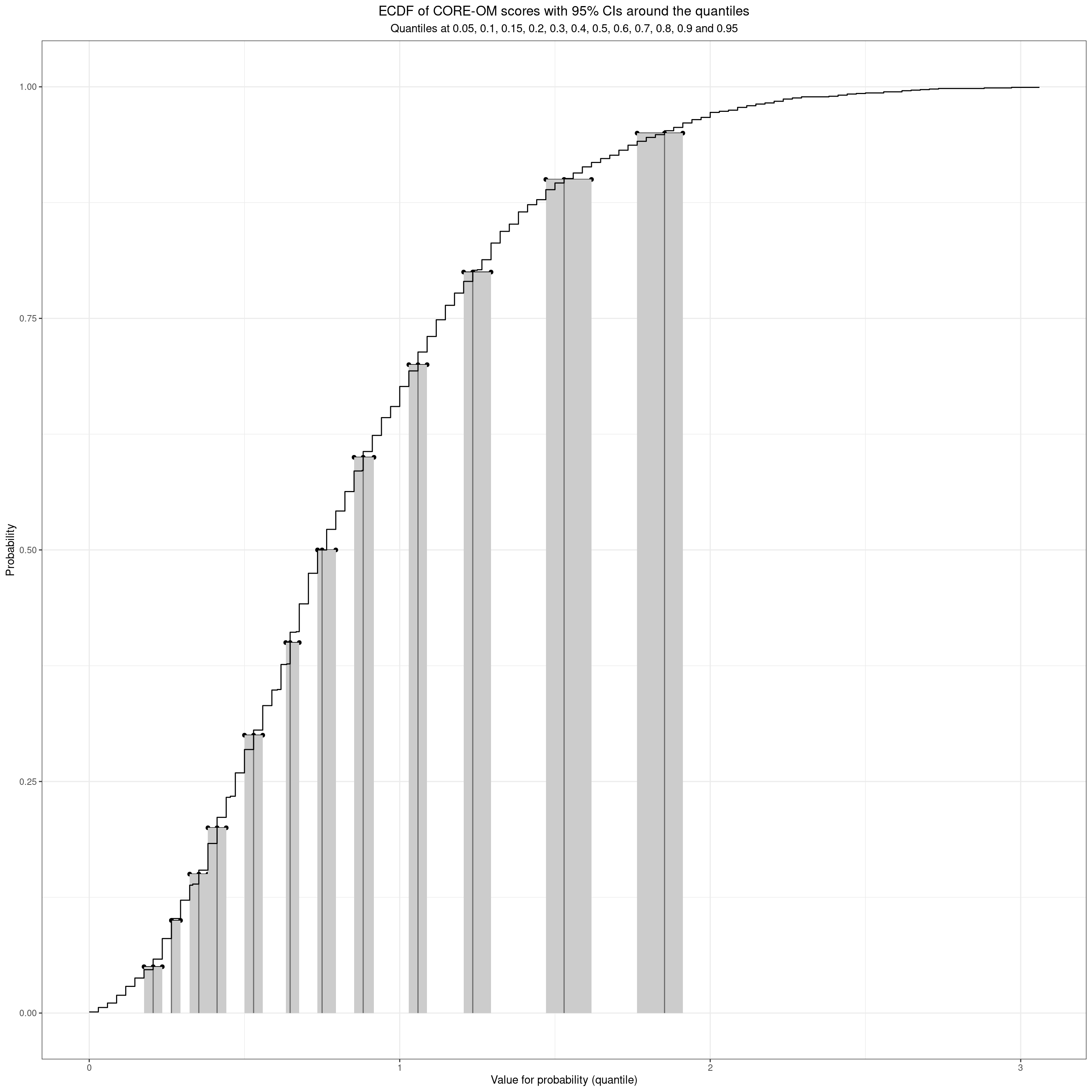 titleText = "ECDF of CORE-OM scores with 95% CIs around the quantiles",