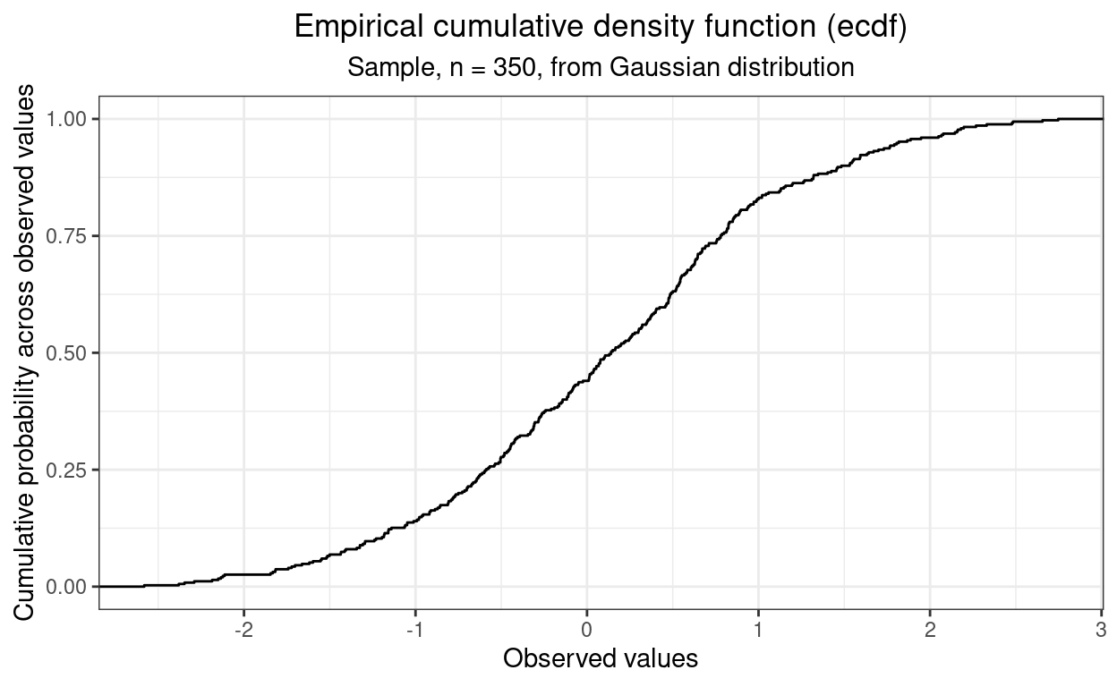 Here is the ecdf for a simulated sample n = 350. That sample has been created using R’s rnorm() function which gives an approximation to a truly random, independent observation, sample from a true Gaussian population. It’s as good an approximation as I will ever really need (and this is not the place to dig into why it’s an approximation though a bit of that will come back to us later).