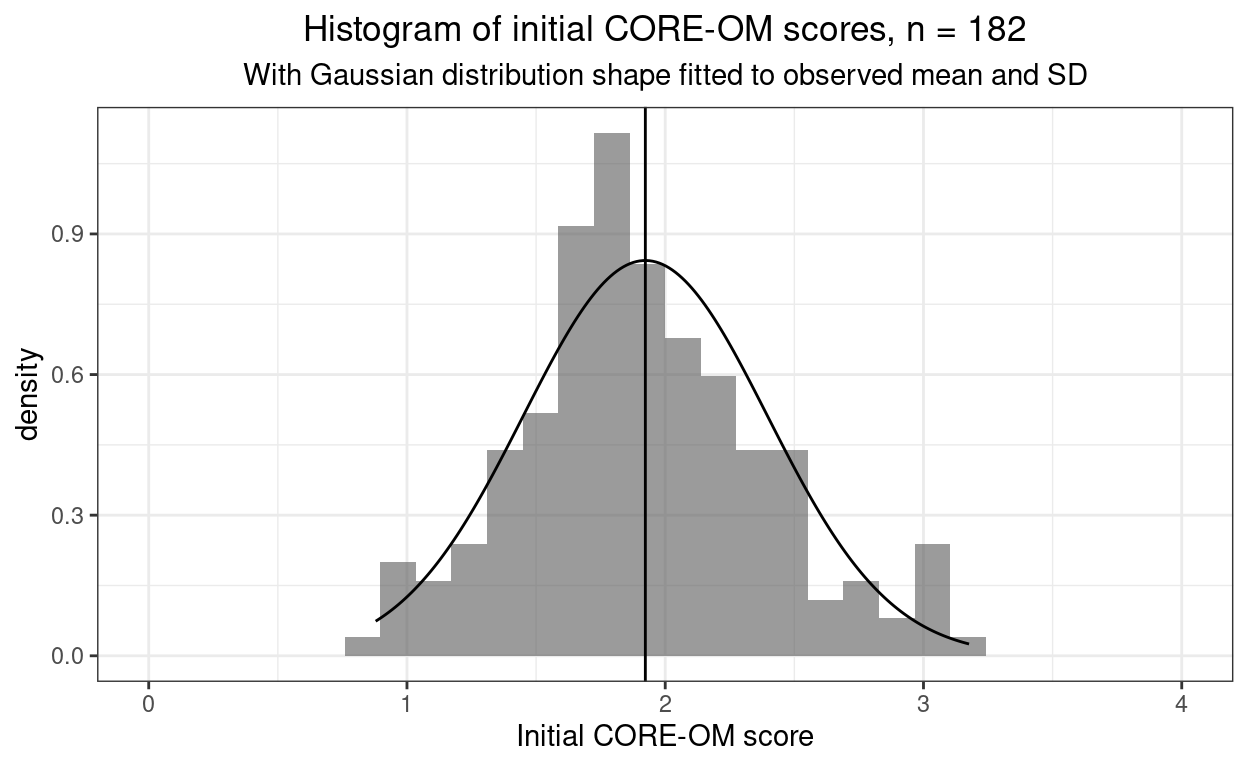 So this is about testing whether or not a dataset of values, scores maybe, fits the Gaussian distribution. The simple answer for any real data I’ve every handled was “no”, and I’m sure that will remain true for any future real datasets I handle. That’s because the Gaussian distribution is a smooth distribution of scores from minus infinity to plus infinity and I think we can safely say that no real dataset, at least in my application areas of mental health and therapy data, is going to have values at minus or plus infinity. Equally, none I handle will be be truly continuous, i.e. smooth; they will always be “discrete” growing in finite steps. For example, on the mean item scoring of the CORE-OM, assuming that all 34 items are completed, the possible scores range from 0 to 4 in steps of 1/34, i.e., steps of 0.0294118. That means that the possible score range is from