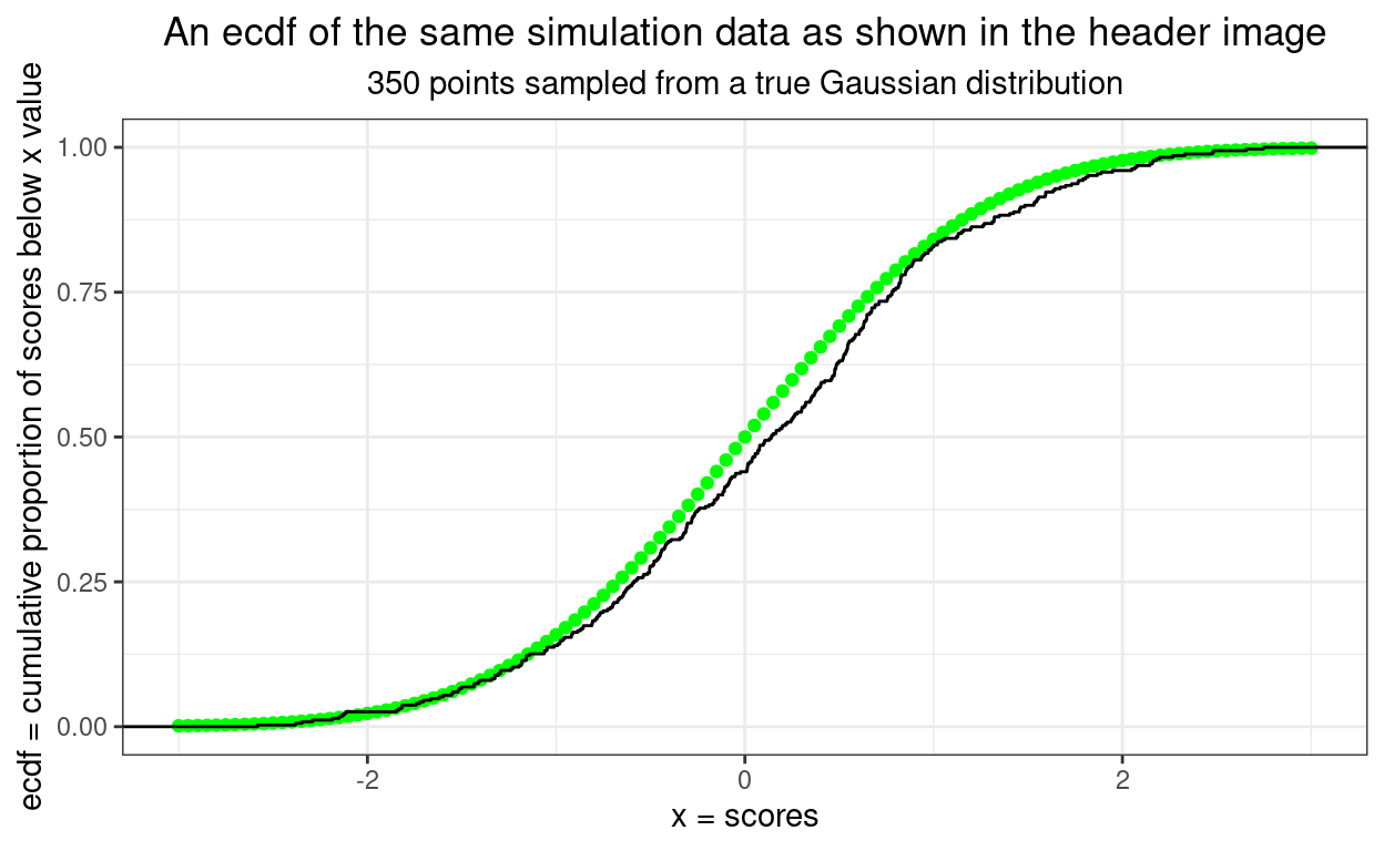 This follows on from my recent post about the Kolmogorov-Smirnov test and then Tests of fit to Gaussian distribution. In many ways it would have been more logical to have started with this post as generally visual inspection should precede testing but I got down this rabbit hole from testing many distributions in simulations where visual inspection wasn’t realistically possible. All three of these posts link with and expand upon entries in my online glossary for the OMbook.