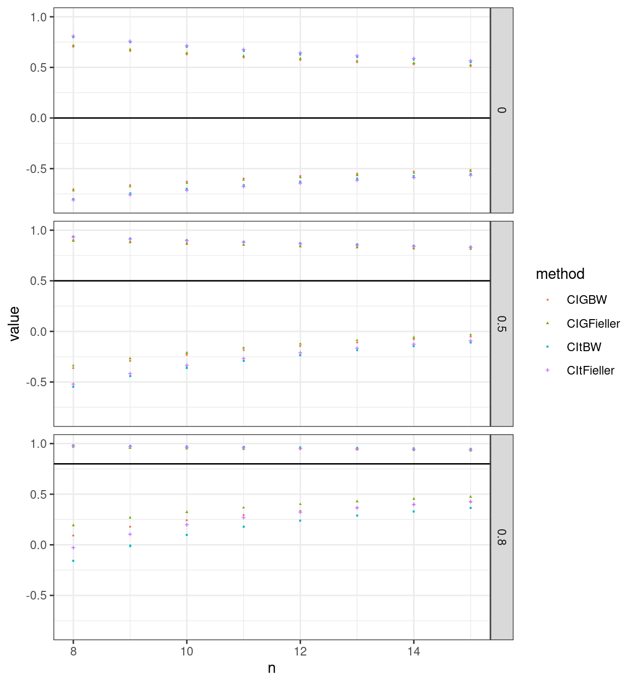 That seems to show fairly clearly that for the zero correlation case the B&W, i.e. the Bonett & White (2000) approximation gives slightly tighter CIs than the FH&P, i.e. the Fieller, Hartley & Pearson (1957) one but that the approximations have the reverse relationship with CI widths for the non-zero correlations.
