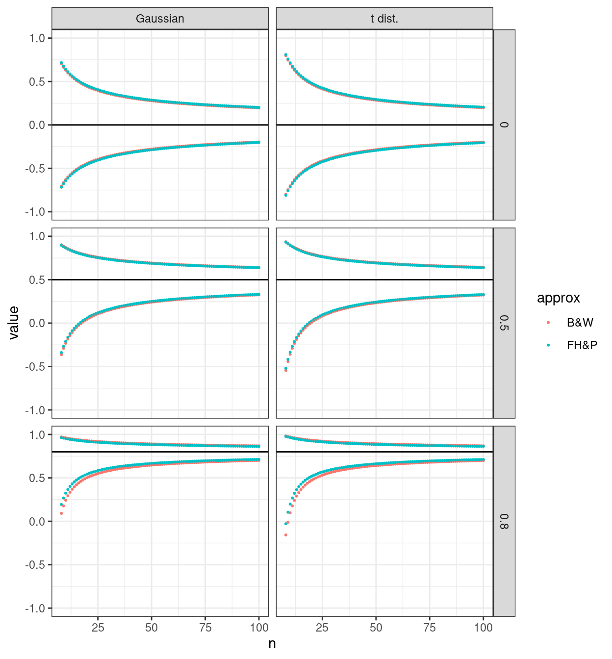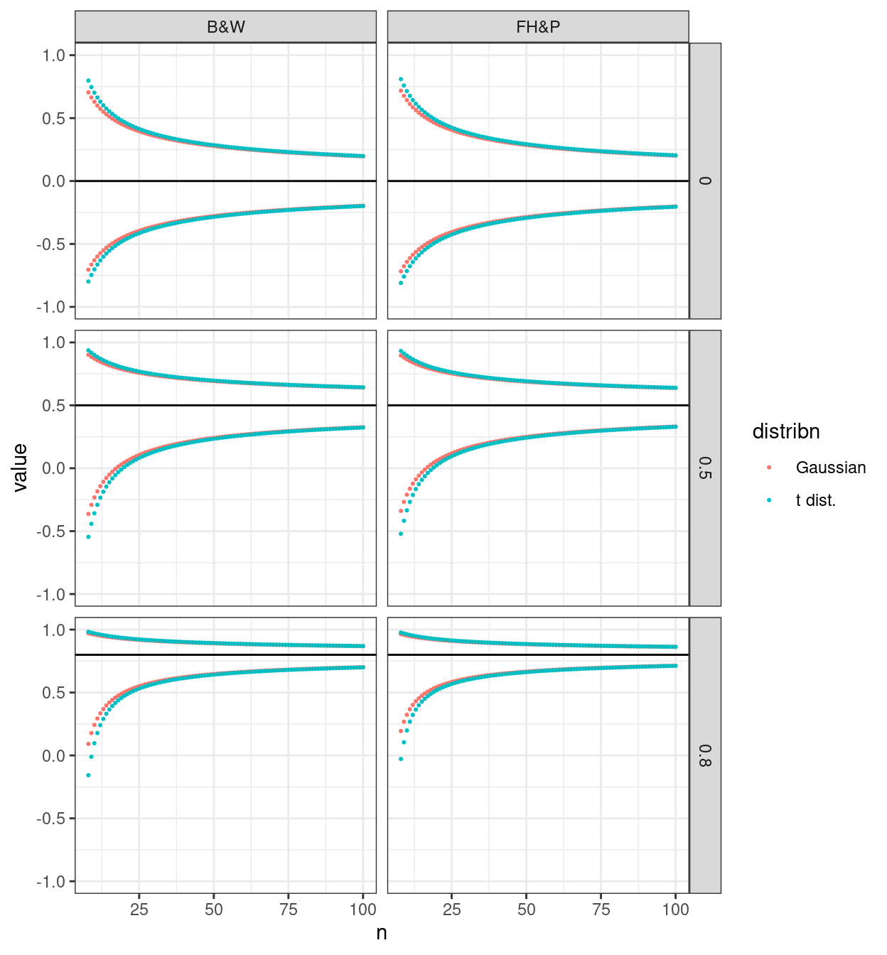 This first plot pulls the issue of looking up against the Gaussian or t distributions to the columns in the facetted plot allowing a clearer comparison of the two approximations to the SE of the correlation.