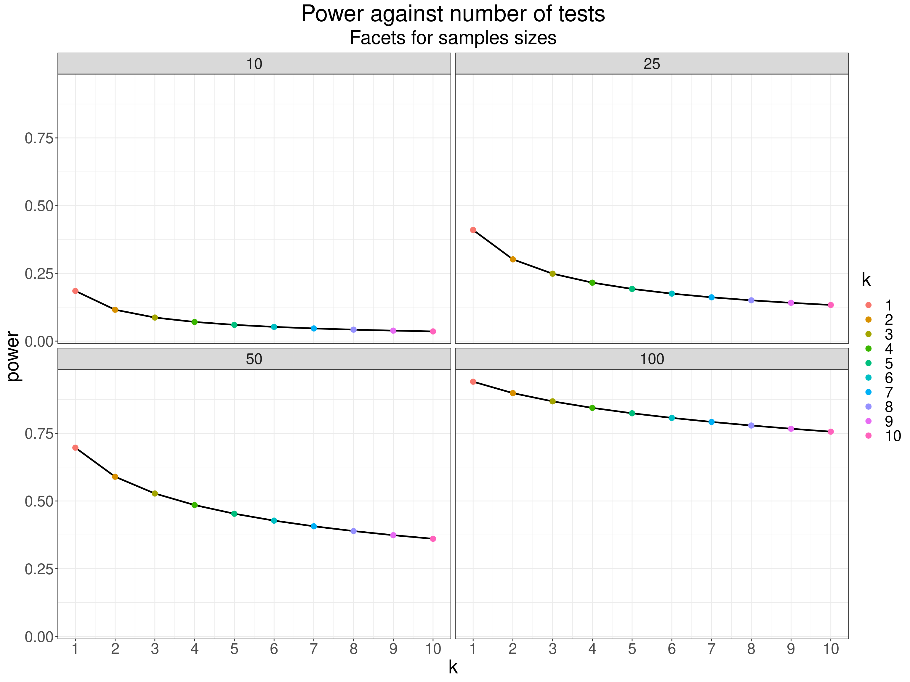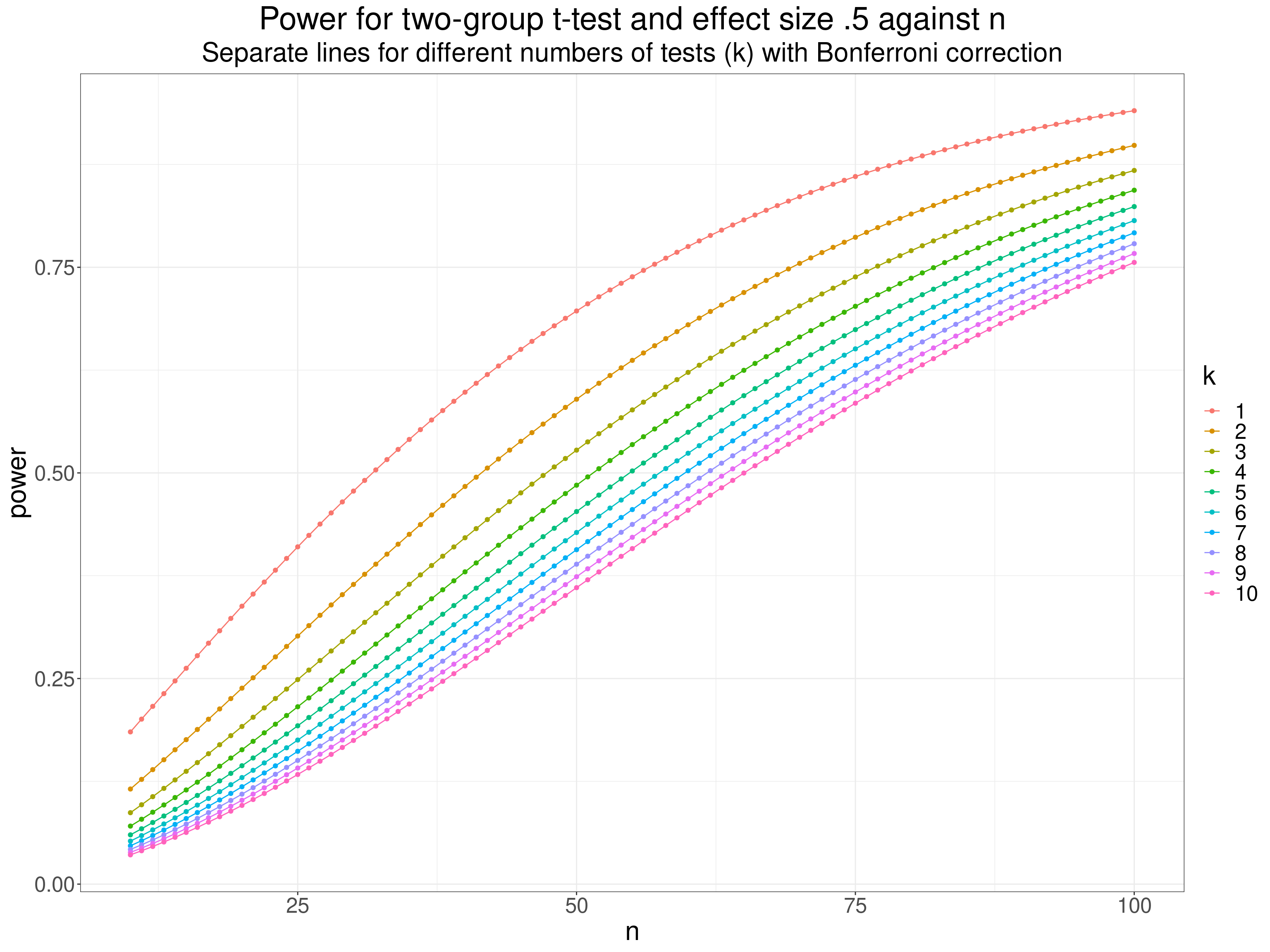# paste0("Separate lines for different numbers of tests (k) with Bonferroni correction",