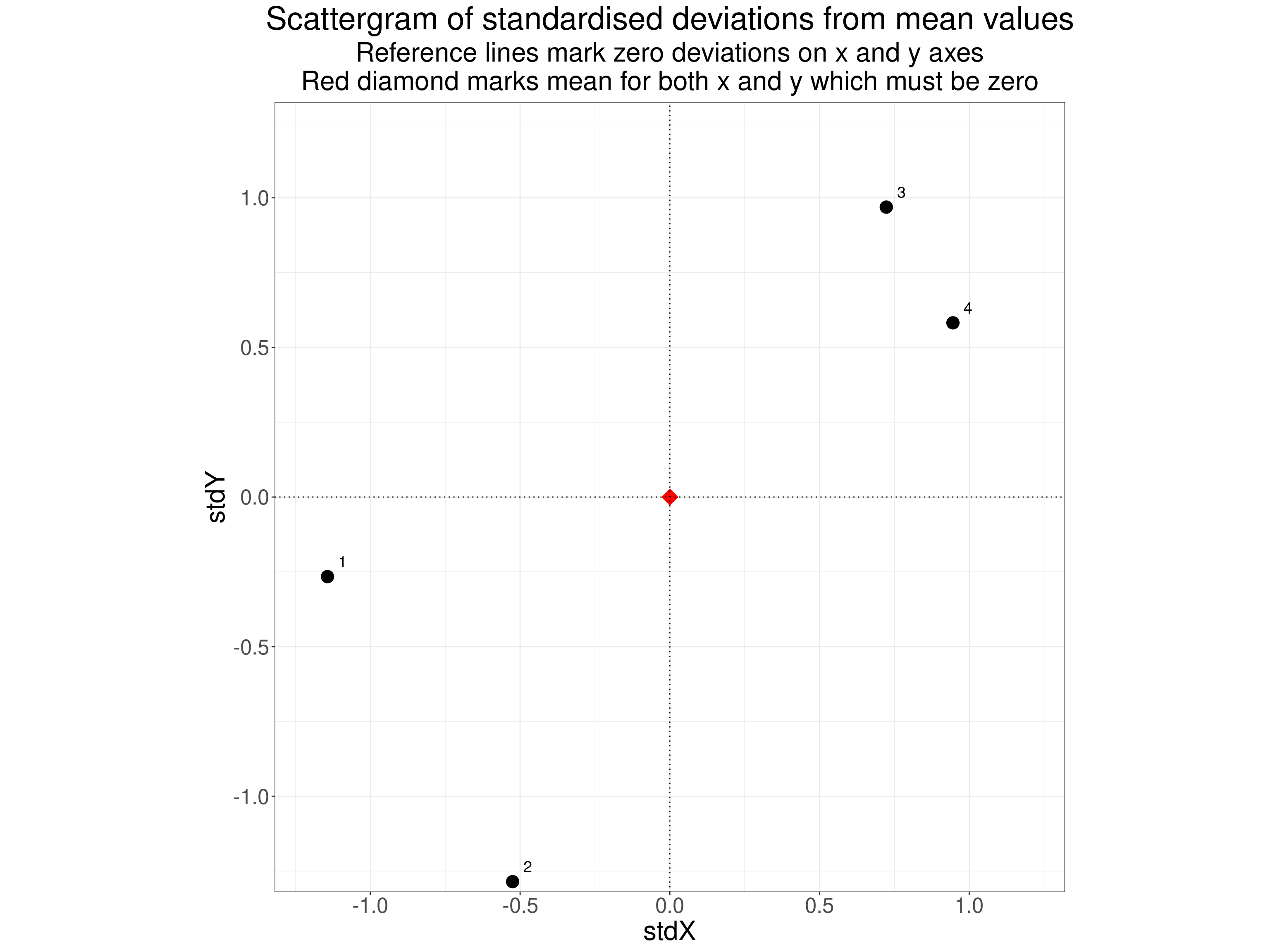 We get to the Pearson correlation coefficient in effect by standardising each of the variables, i.e. replacing the scores by their deviation from their mean score and then dividing those deviations by the standard deviation of each variable. For our little dataset that gives us this.