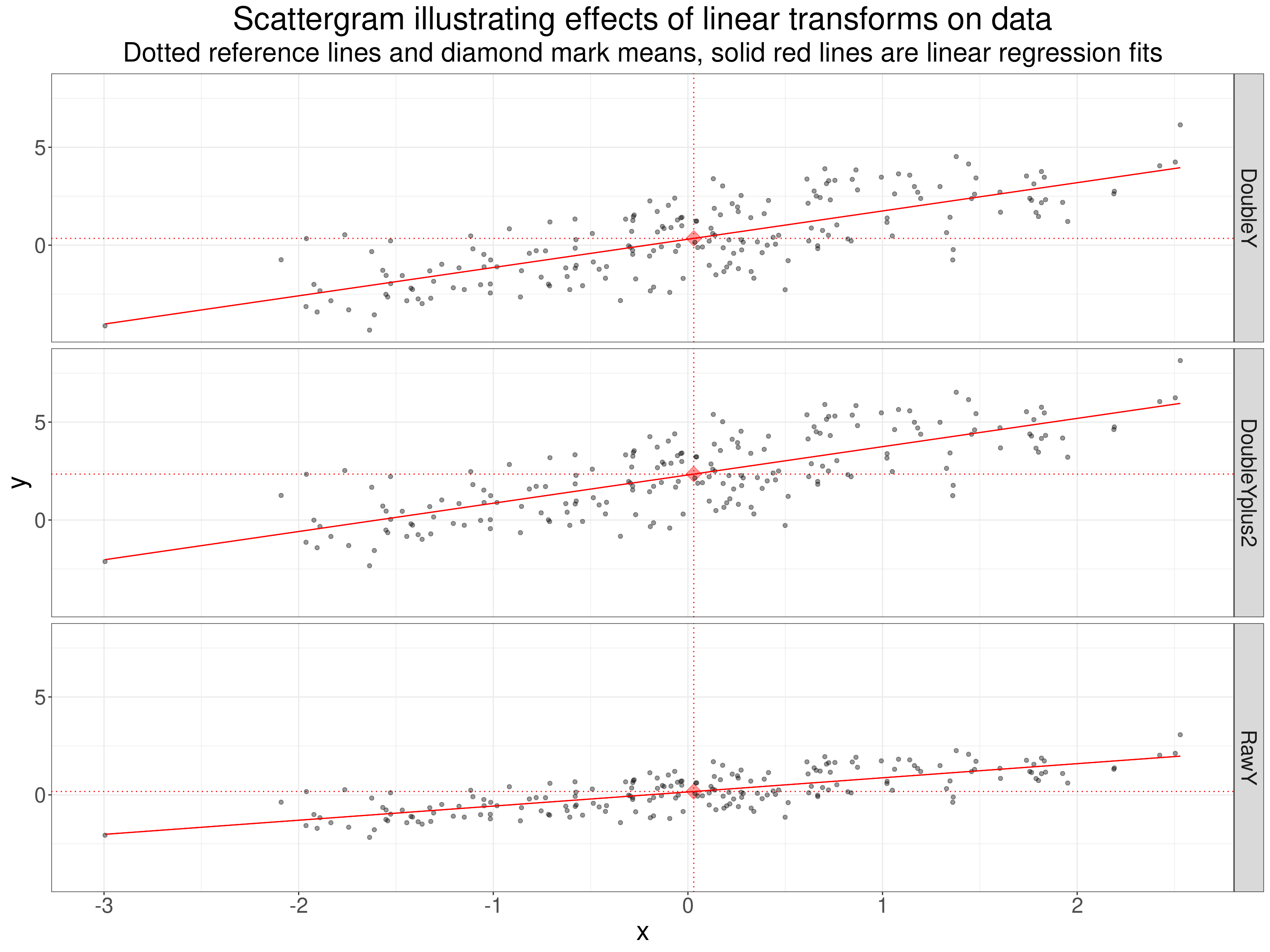 ggtitle("Scattergram illustrating effects of linear transforms on data",