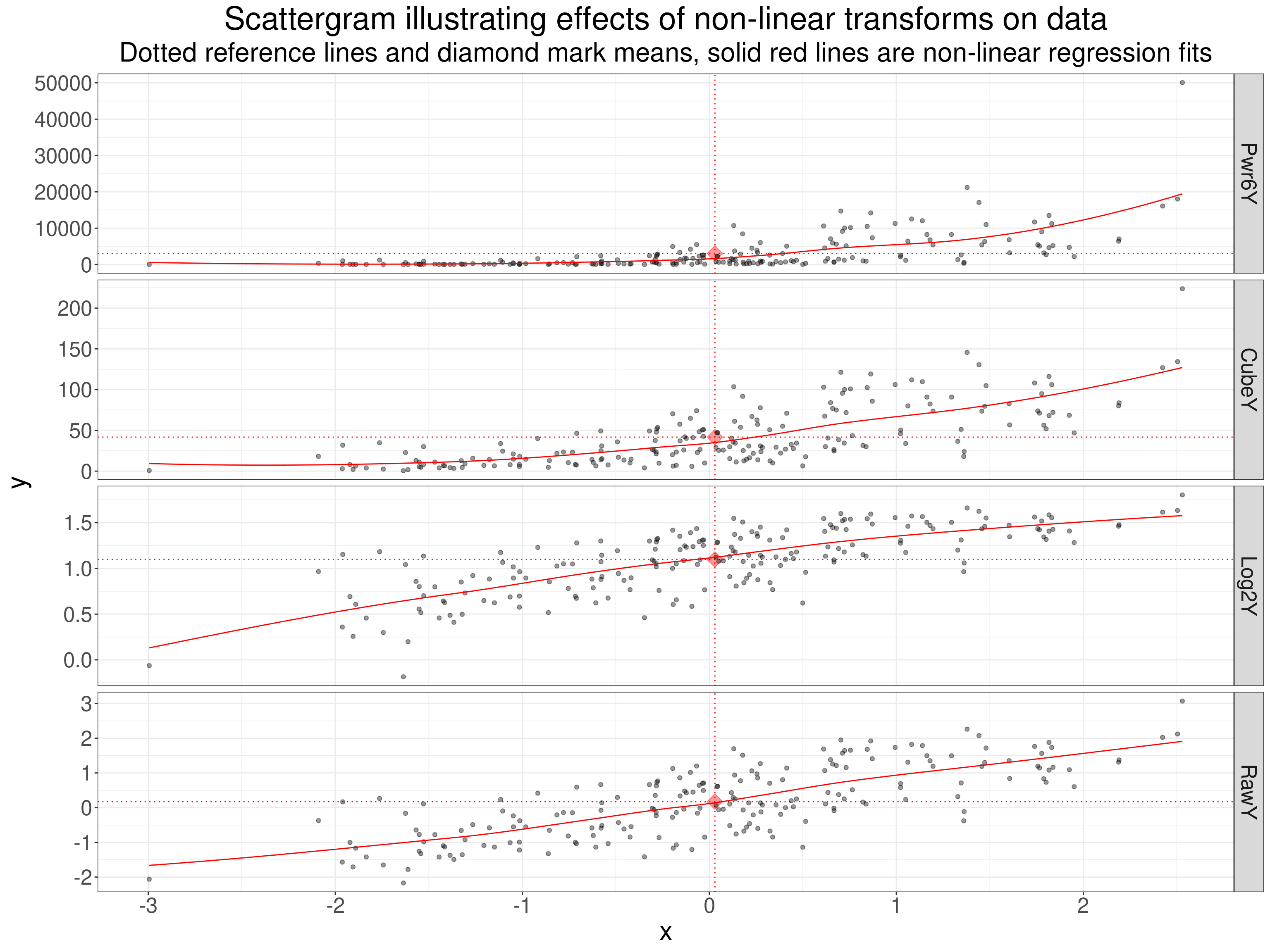 ggtitle("Scattergram illustrating effects of non-linear transforms on data",
