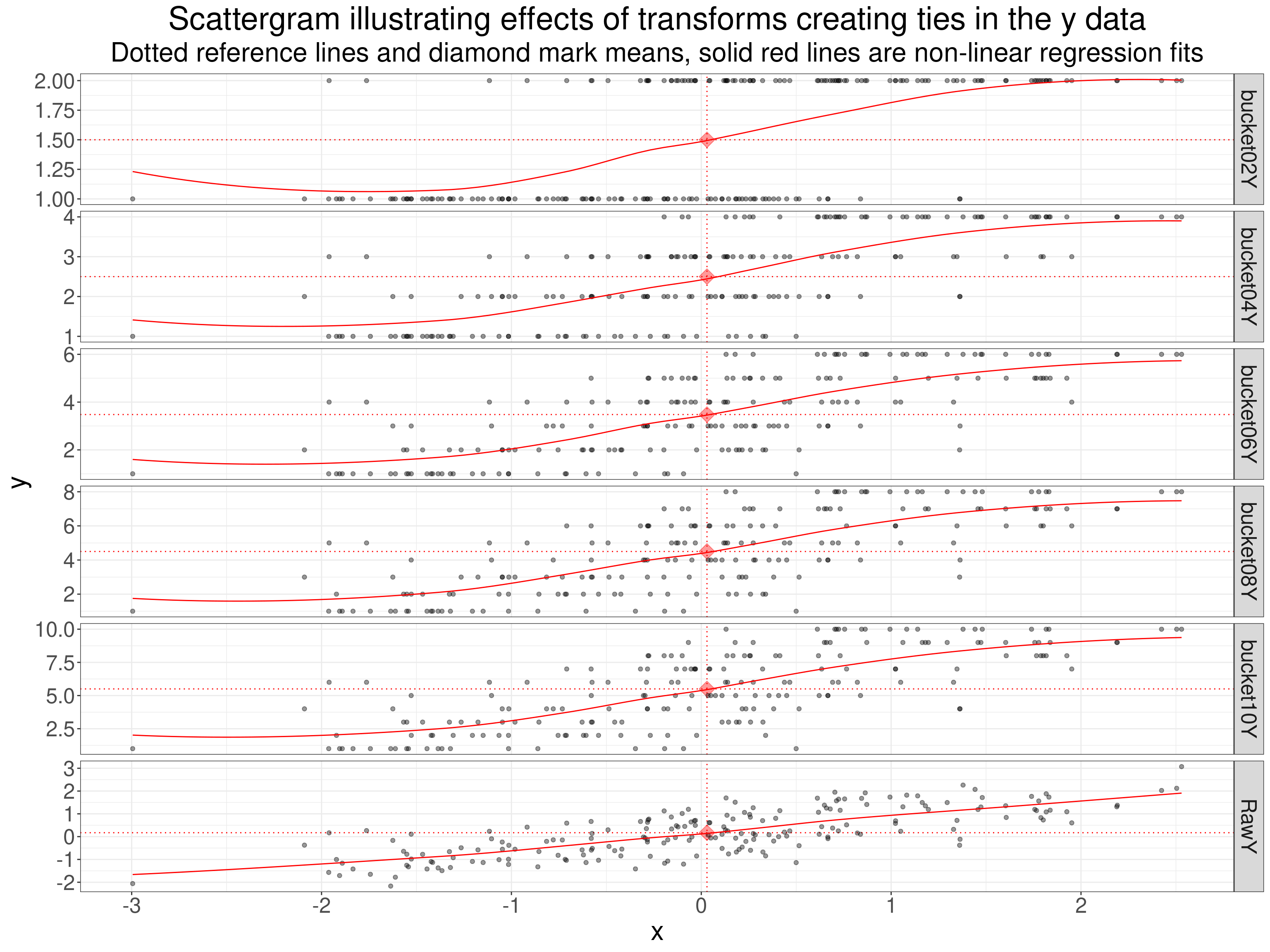 ggtitle("Scattergram illustrating effects of transforms creating ties in the y data",