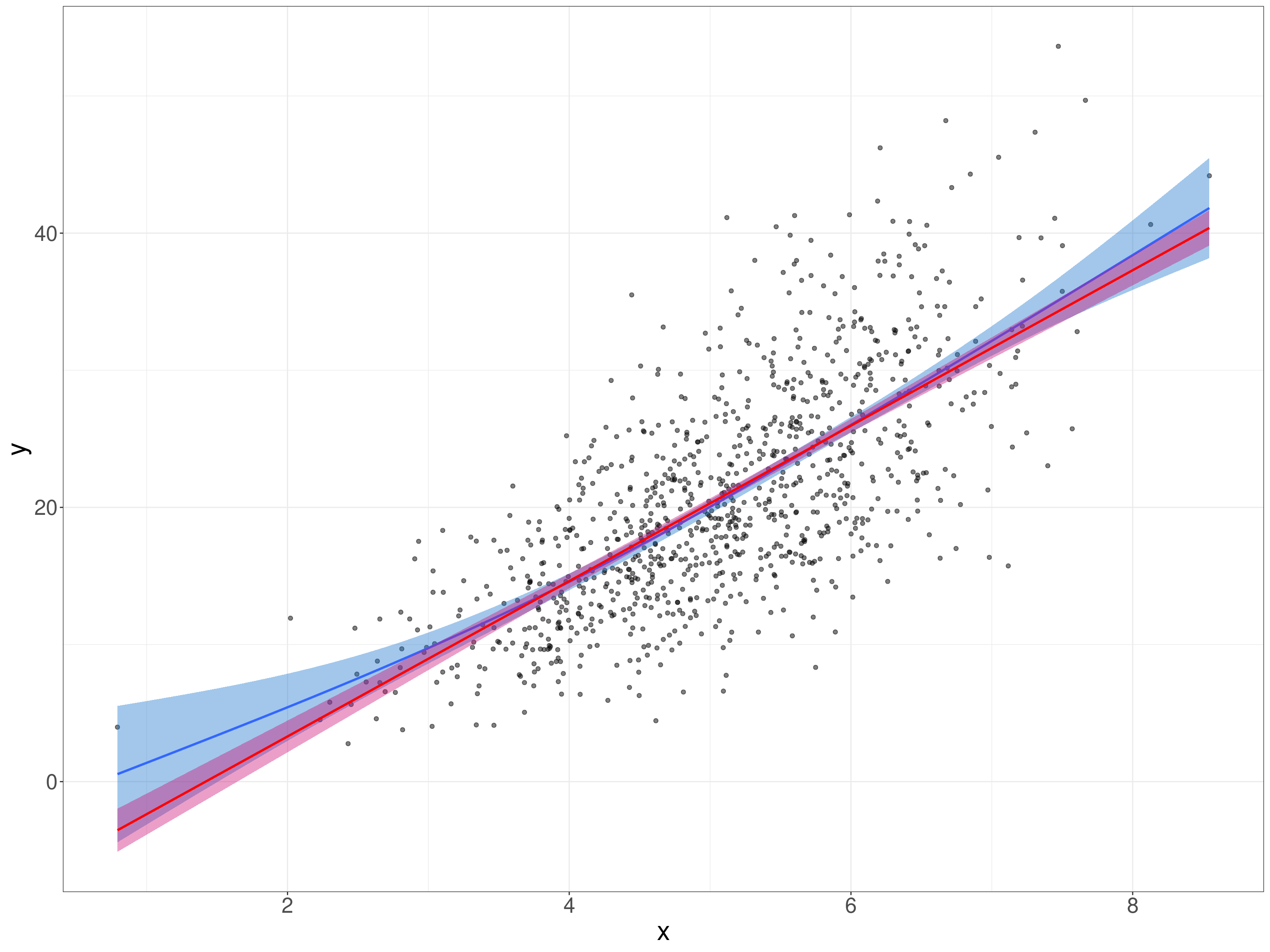 "\nblue line is LOESS smoothed regression, both with 95% CIs"))