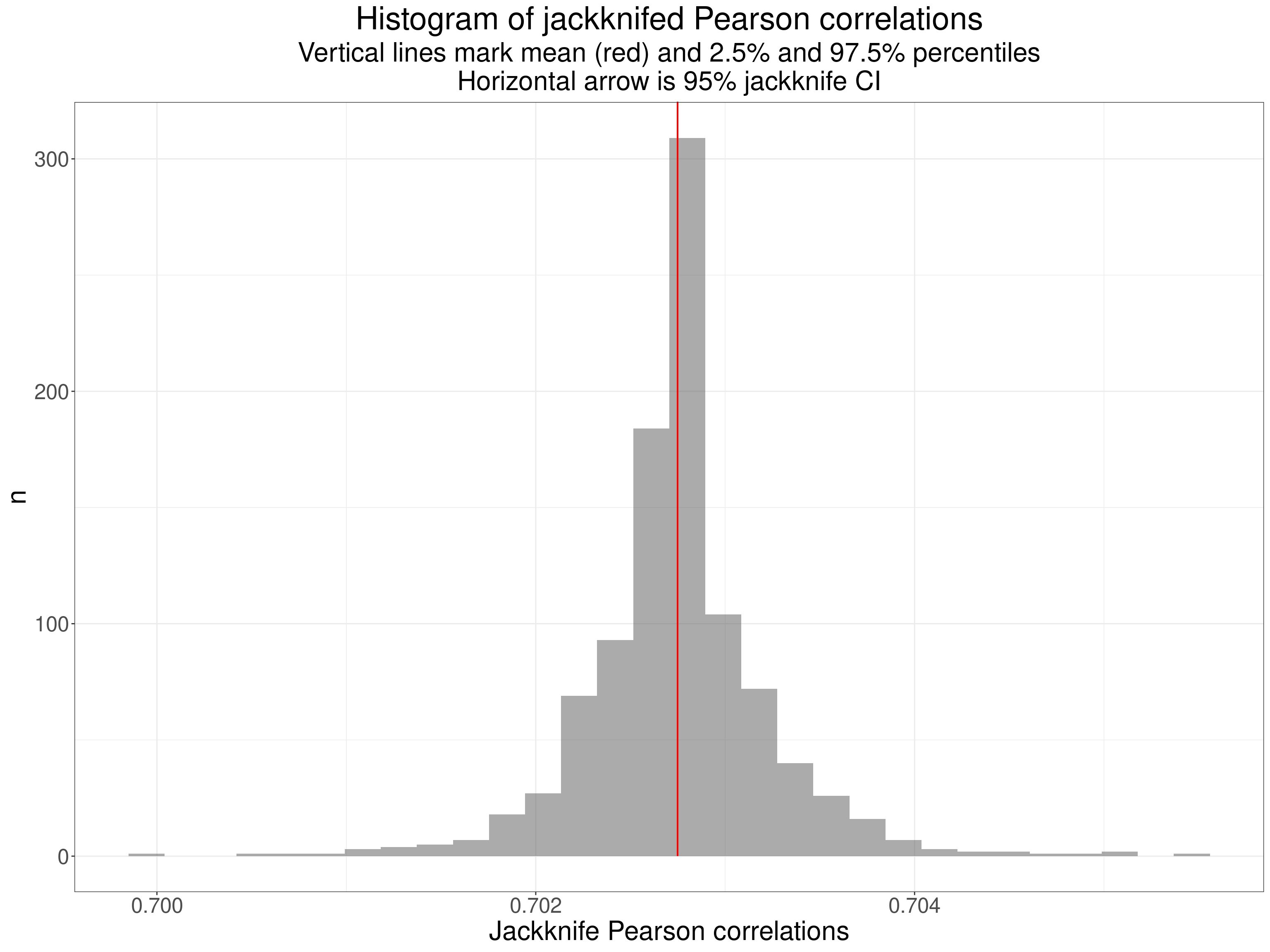 The jackknife resamples had correlations ranging from 0.7 to 0.7055 with mean 0.7027. (The raw correlation was 0.7027 showing little or now bias in the jackknifing.) The jackknife CI is obtained from the standard error of these resampled correlations and th e 95% CI was 0.6725 to 0.733: close to the parametric CI but not quite identical.