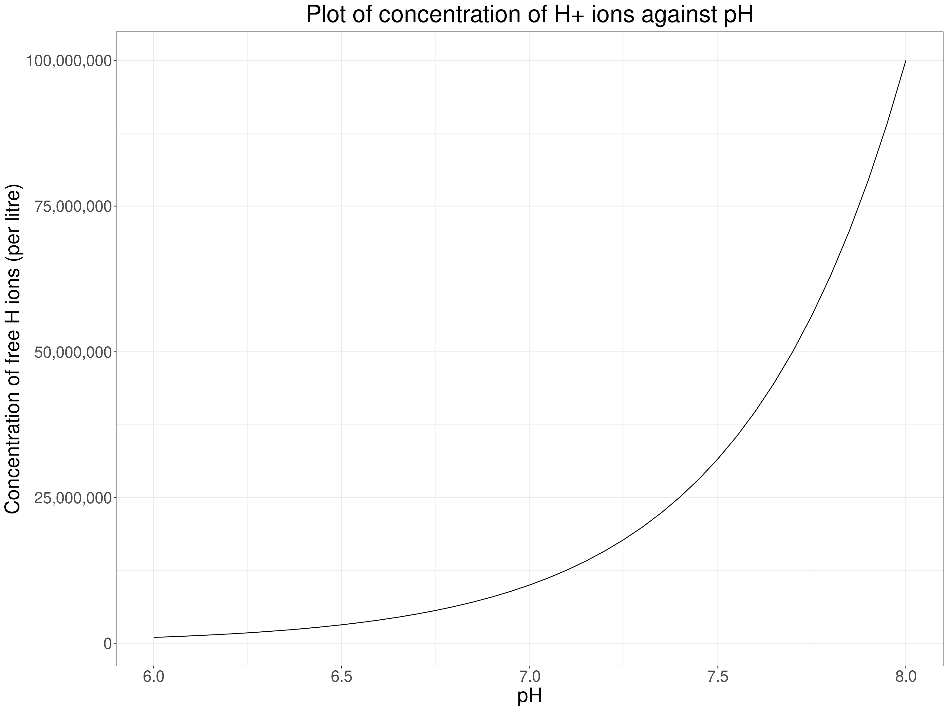 scale_y_continuous("Concentration of free H ions (per litre)",