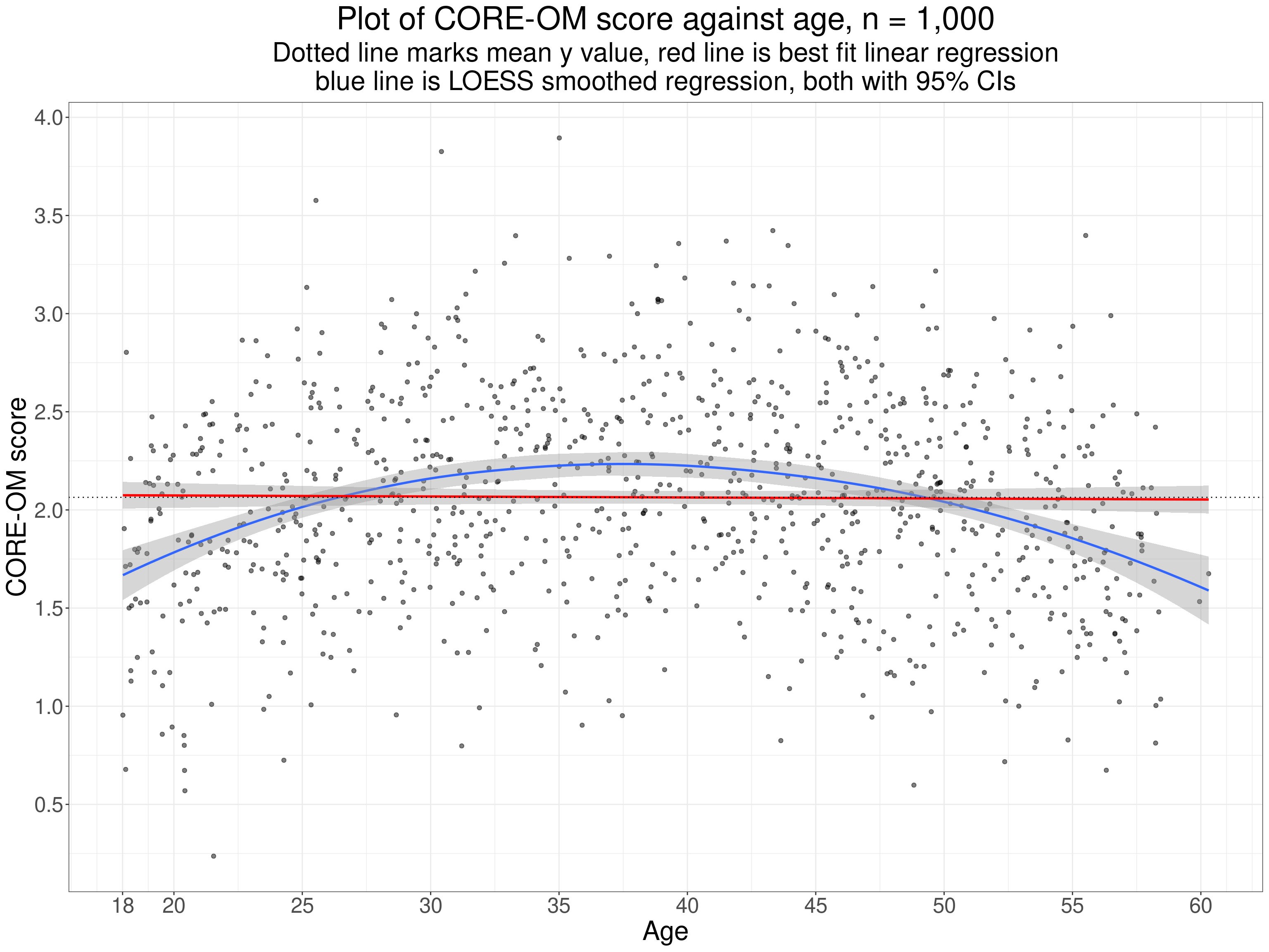 Clearly anyone can get around this by making sure that they inspect the scattergram. This is a simulated example (but not 100% implausible) of a general population sample plotting CORE-OM scores against age.