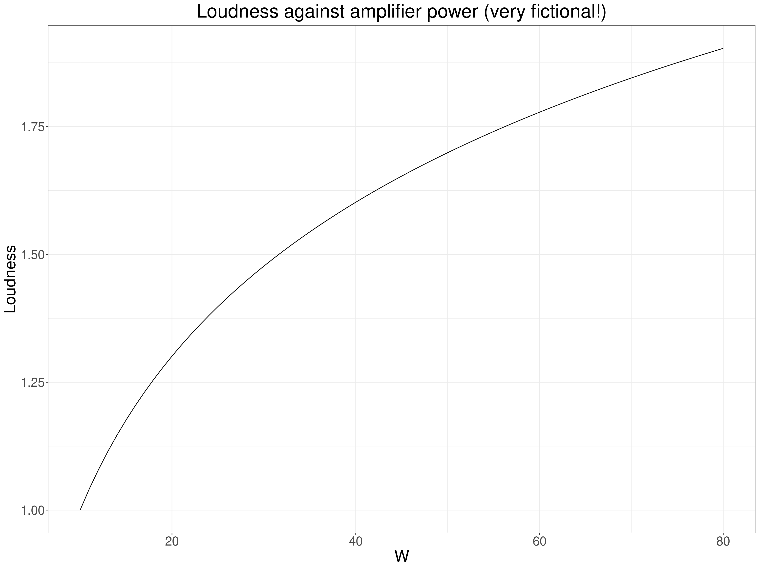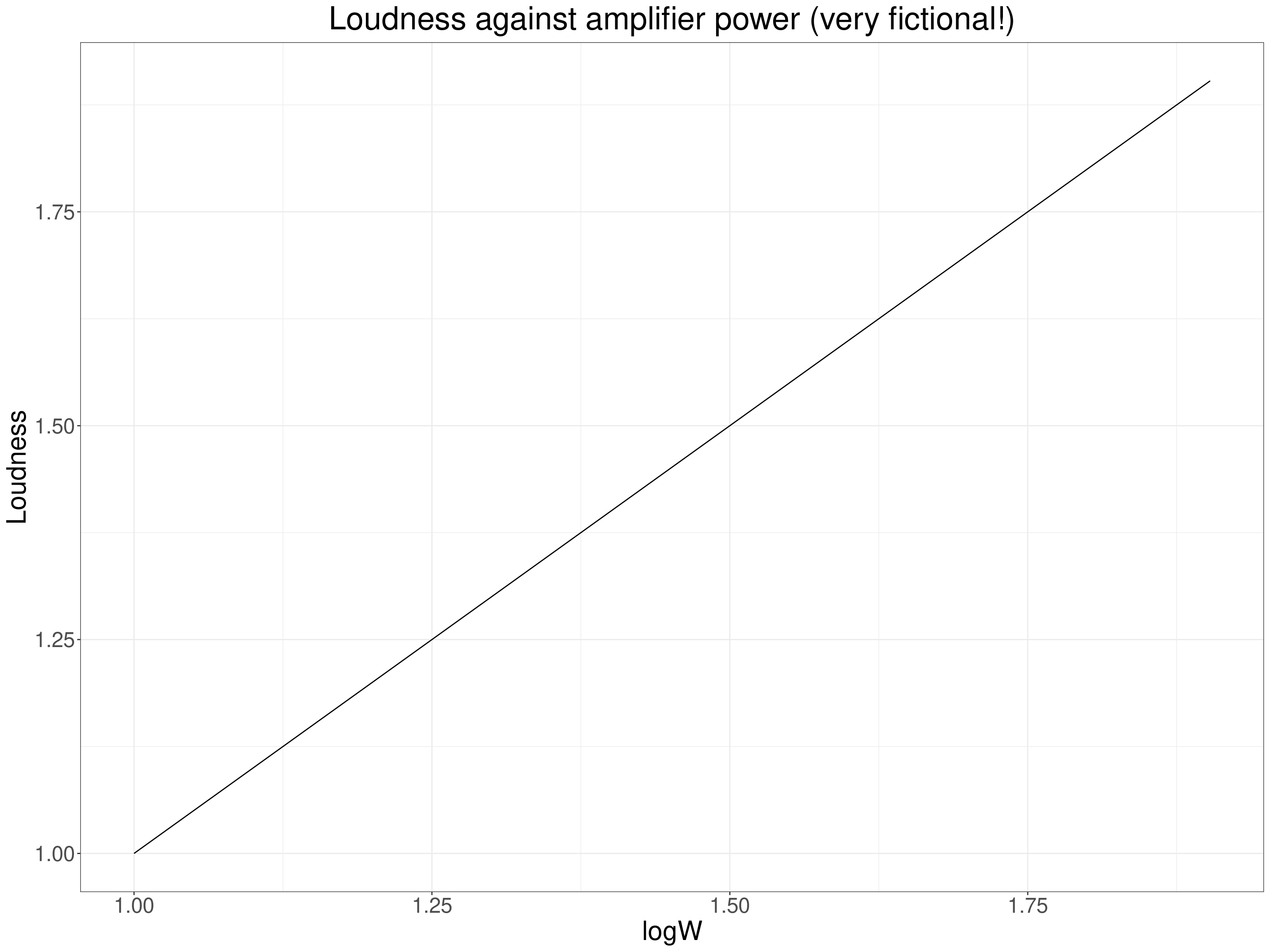 Getting a bit more psychological decibels (dB) are used to measure the sound levels and it is another logarithmic scale: for our purposes the energy of a sound level of 30dB is 10 times that of a sound level of 20dB and a level of 40dB is 100 times that of 20db. Our perception of sound levels is roughly logarithmic. The same is true of light intensities and some other perceptual levels: the Weber-Fechner Law (ooh, this takes me way back to 3rd year university and doing some psychology!) So if we had people’s ratings of sound level in relation to different powers of amplifier playing them the same sounds (in the same setting and distance from the speakers!) we might see another non-linear relationship.