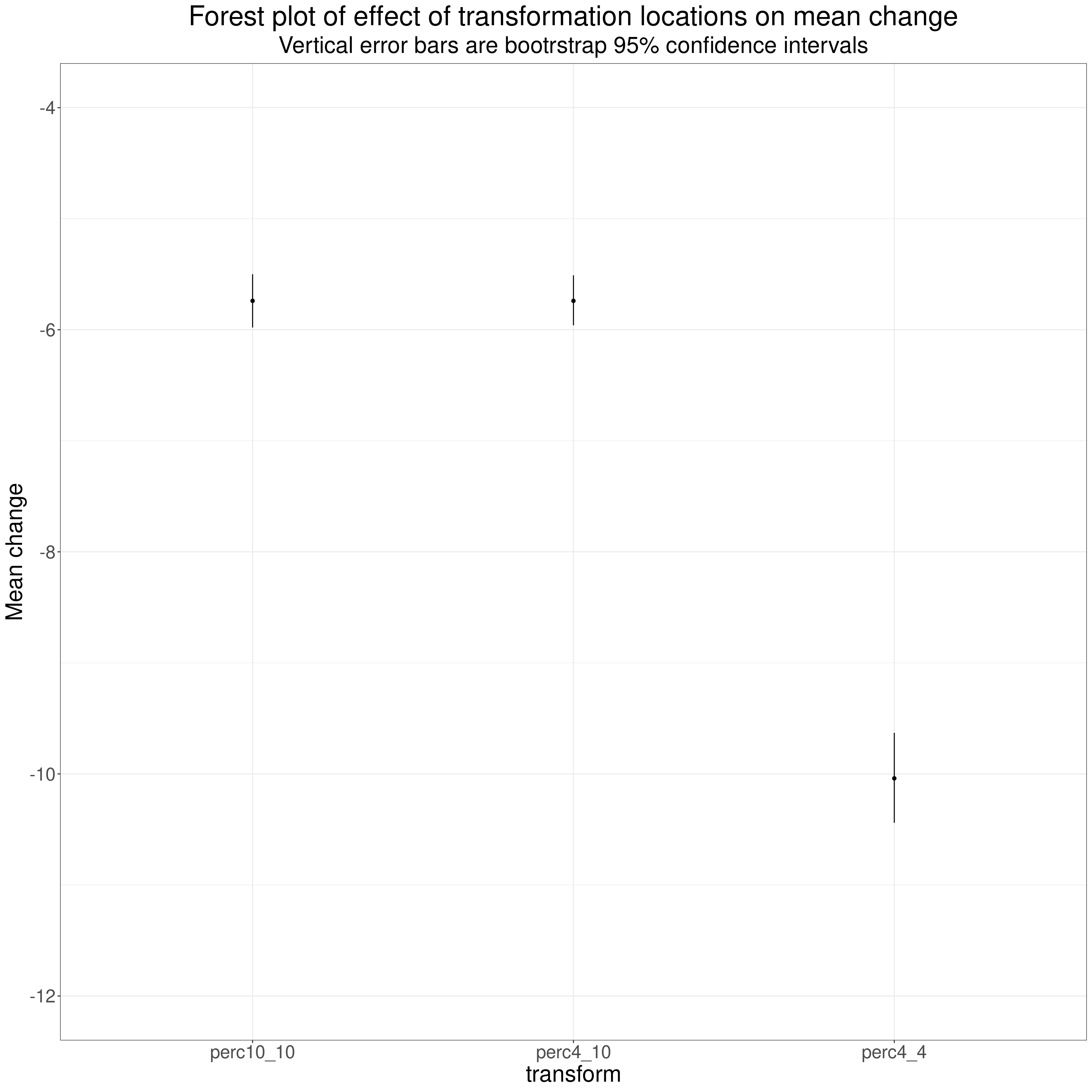 ggtitle("Forest plot of effect of transformation locations on mean change",