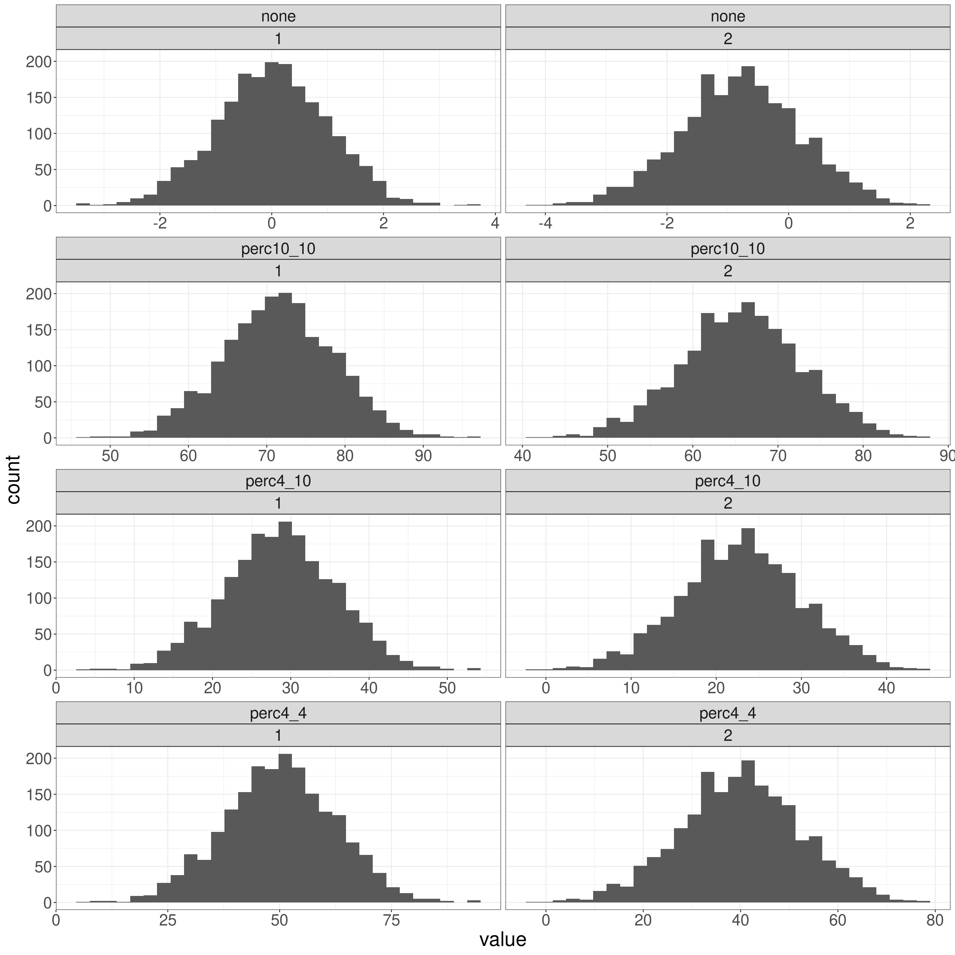 perc4_4”: a percentile transform using a minimum possible score of -4 and a maximum possible score of 4, so centred on (population) mean of the dataThis facetted histogram plot shows what the transforms have done to the distributions (using fixed x axis ranges so the effect of the transforms is blatant).