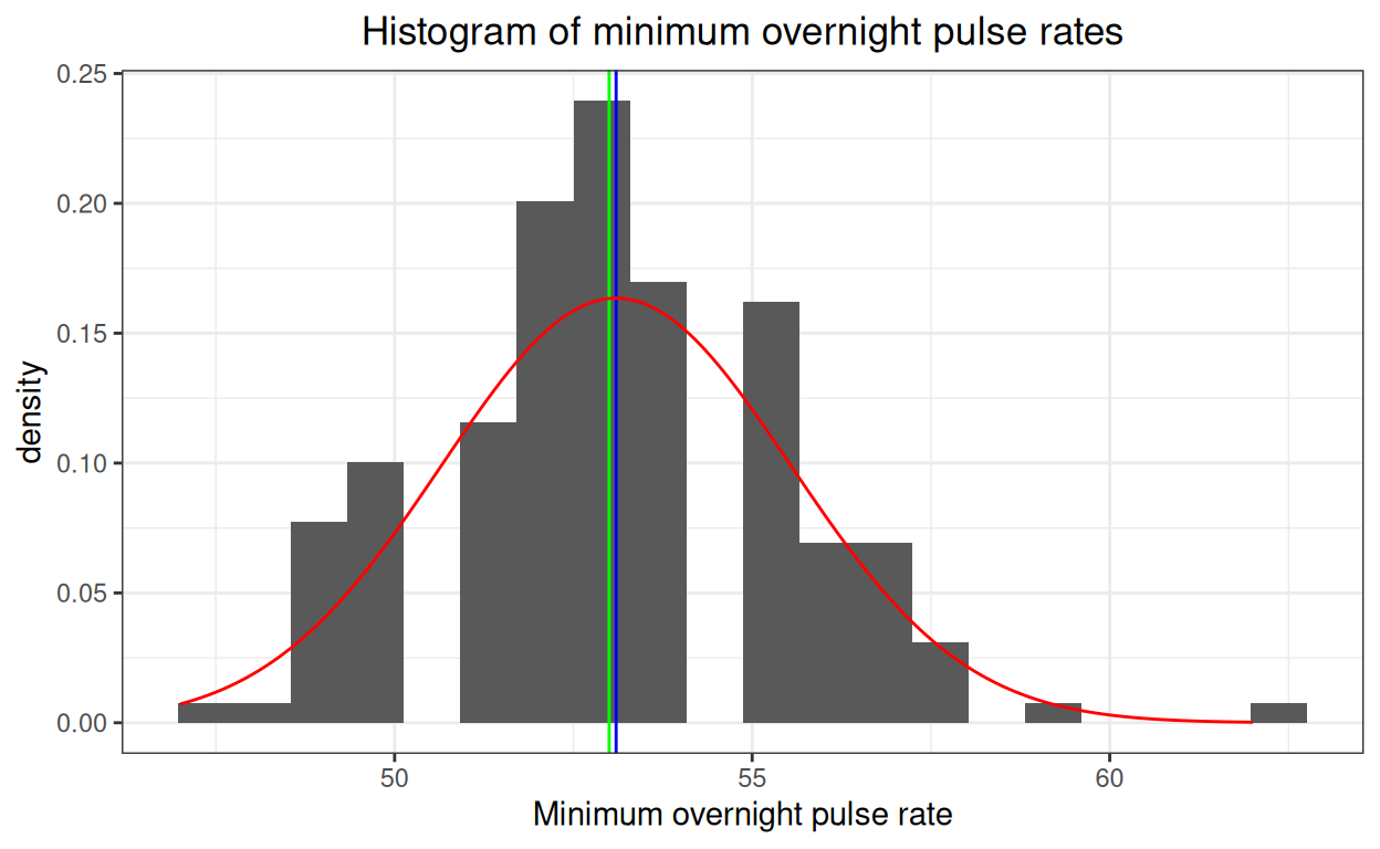Clearly on the data we have these data are not a bad fit to a Gaussian distribution. I wonder if that’s because the minimum is pretty fixed but varying, perhaps fairly randomly, day by day whereas the waking rate is going to be a function of my point in the sleep cycle when the alarm goes off and hence can be quite high but also down near the minimum. Probably showing how little I know about sleep!