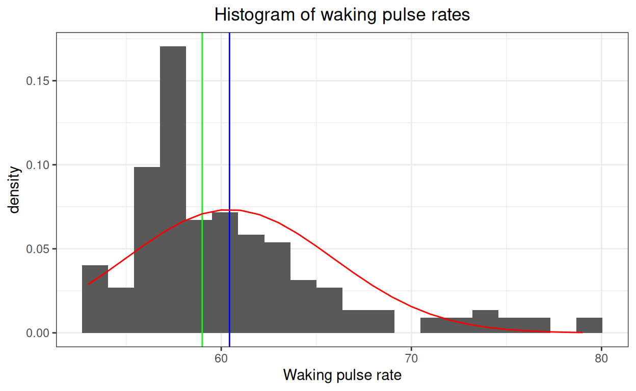 The red lines mark days when for some reason I don’t have a value for my waking pulse, the black points are do the values where I have them (doh!) and the blue line is the “loess” smoothed curve fitting the data and the shaded area around that is its 95% confidence interval. The dashed horizontal line is the arithmetic mean of the values. We can see that the data are right skew. This histogram of the values shows that more clearly.