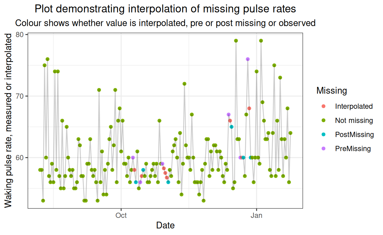 ggtitle("Plot demonstrating interpolation of missing pulse rates",