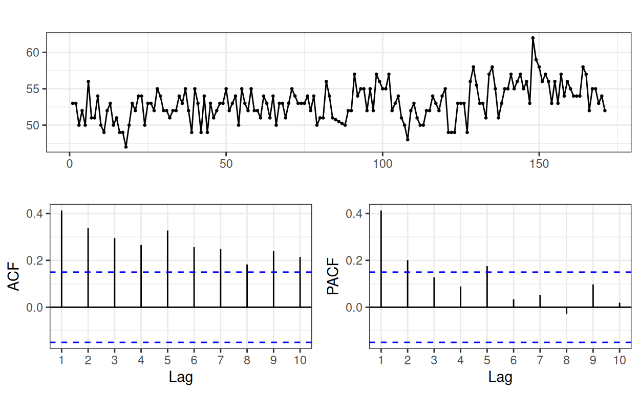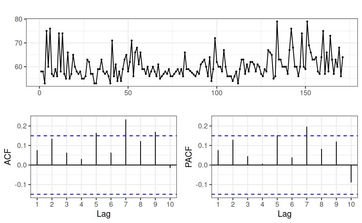 That shows a rather different picture from that for the waking pulse rates. All the simple ACF correlations up to lag 10 look to be statistically significant and the lag 1 ACF correlation is 0.41 which is pretty high. Partialing lag 1 out still leaves the PACF for lag 2 significant at 0.20. There’s a similar PACF correlation for lag 5: 0.18 but I can’t see much reason to regard that as other than a sampling vagary.