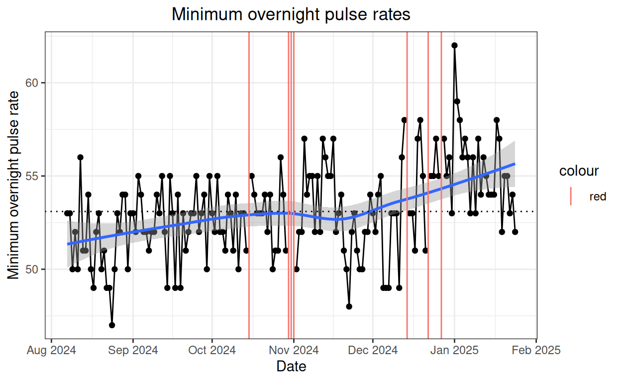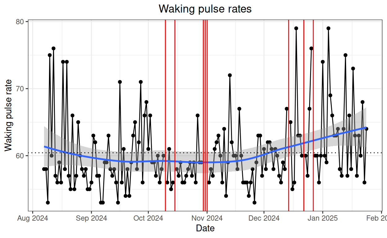 I’m illustrating autocorrelation from a short dataset I created for my own amusement after buying a cheap watch that would tell me my waking and lowest overnight pulse rates. The data I’m using run from 07/08/24 to 24/01/25. Here are the simple descriptive statistics.