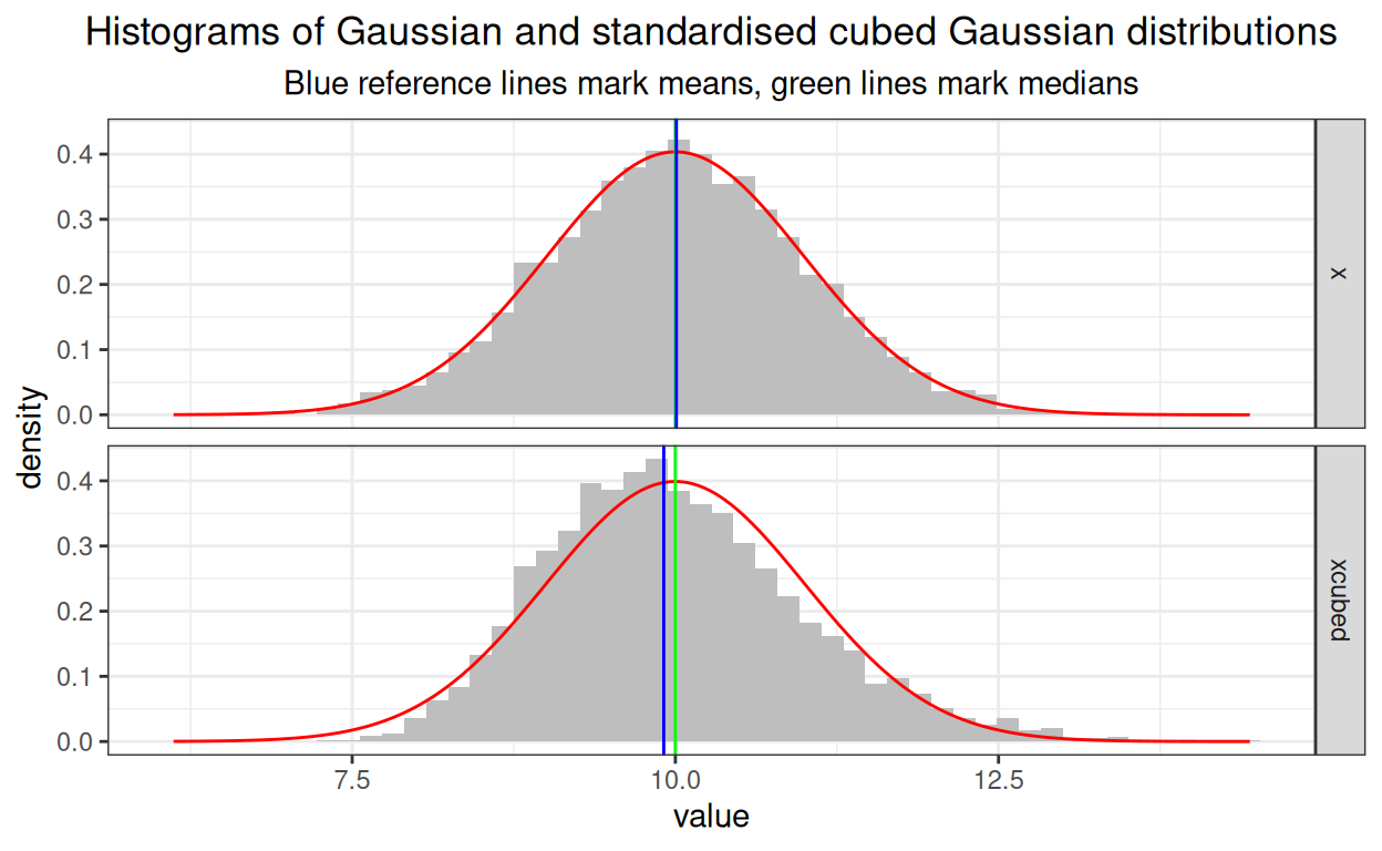ggtitle("Histograms of Gaussian and standardised cubed Gaussian distributions",