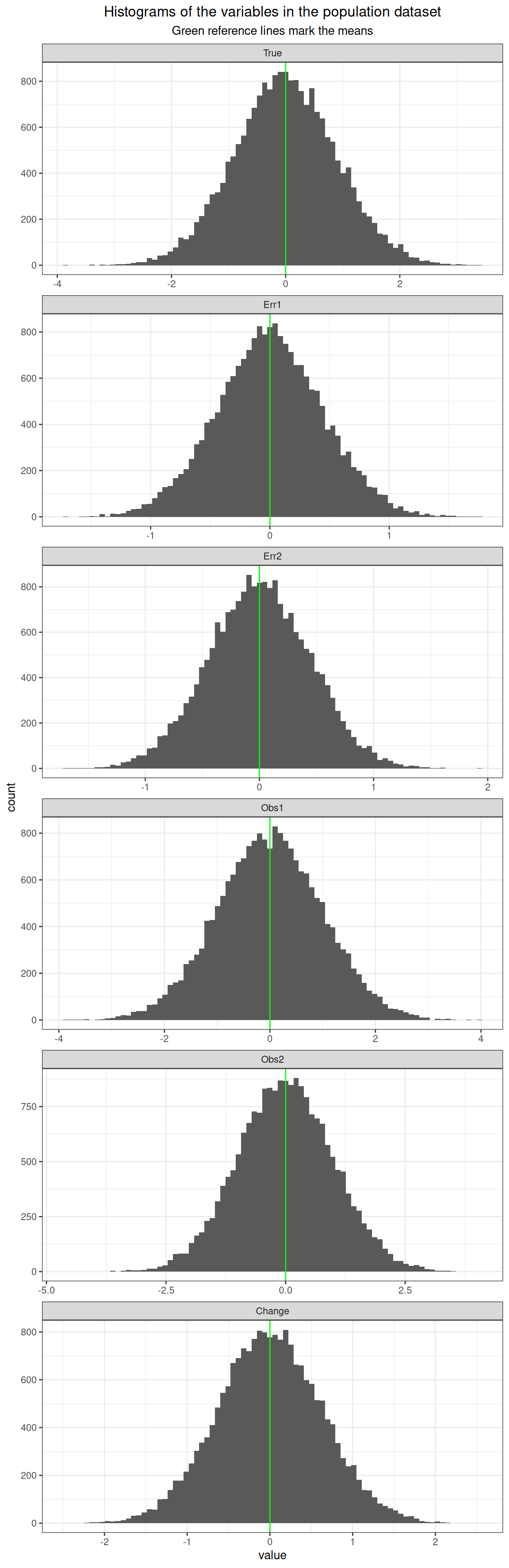 This next block of code creates a large (n = 2^{4}) , but finite, population with three variables: True, Err1 and True2. They each have means set to zero, Gaussian distributions and a covariance matrix exactly matching that desired one. (Hence this is a finite population not a sample, if it were a sample the covariances wouldn’t exactly match the desired matrix owing to the randomness of the sampling.)