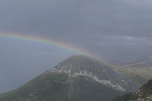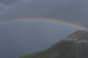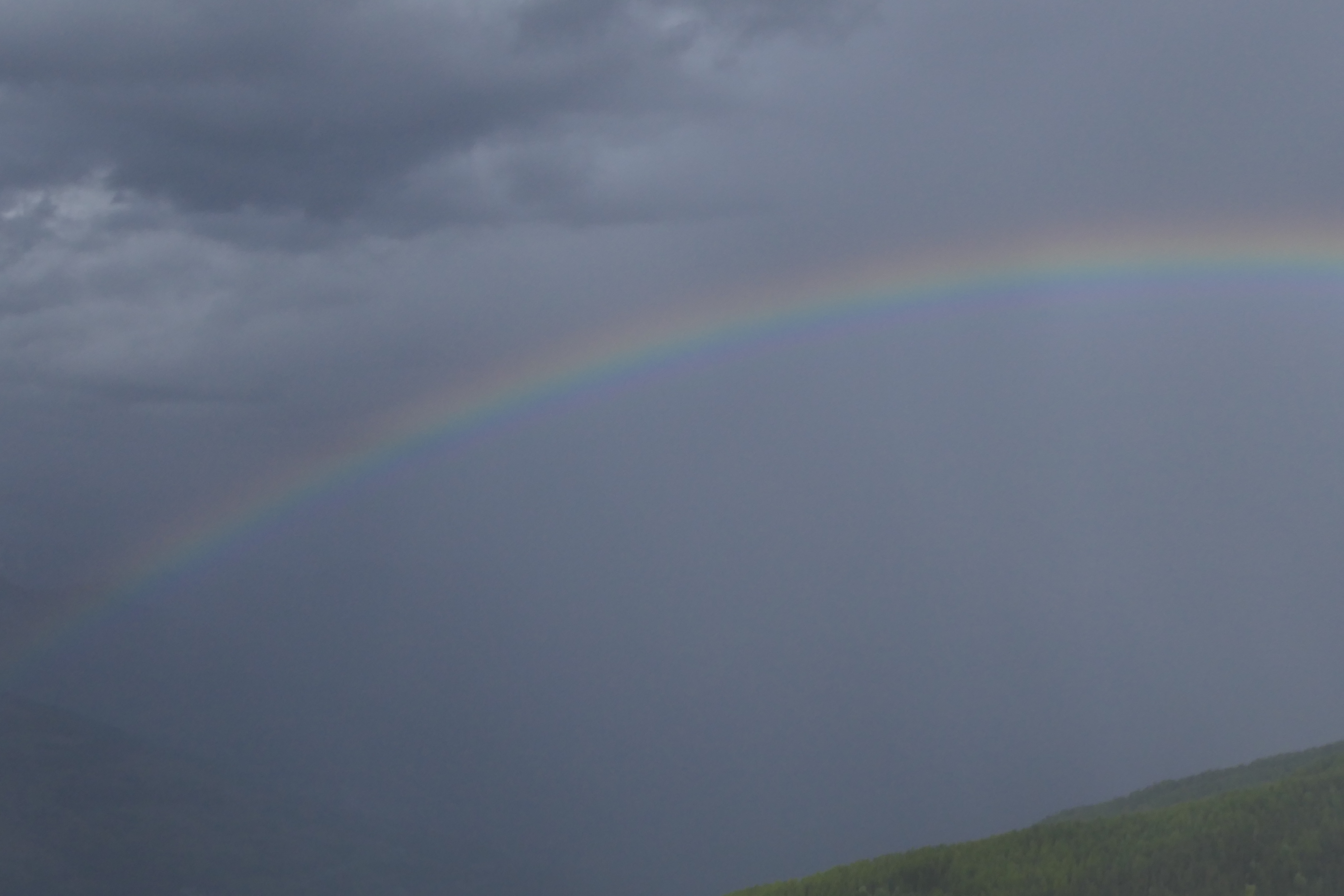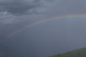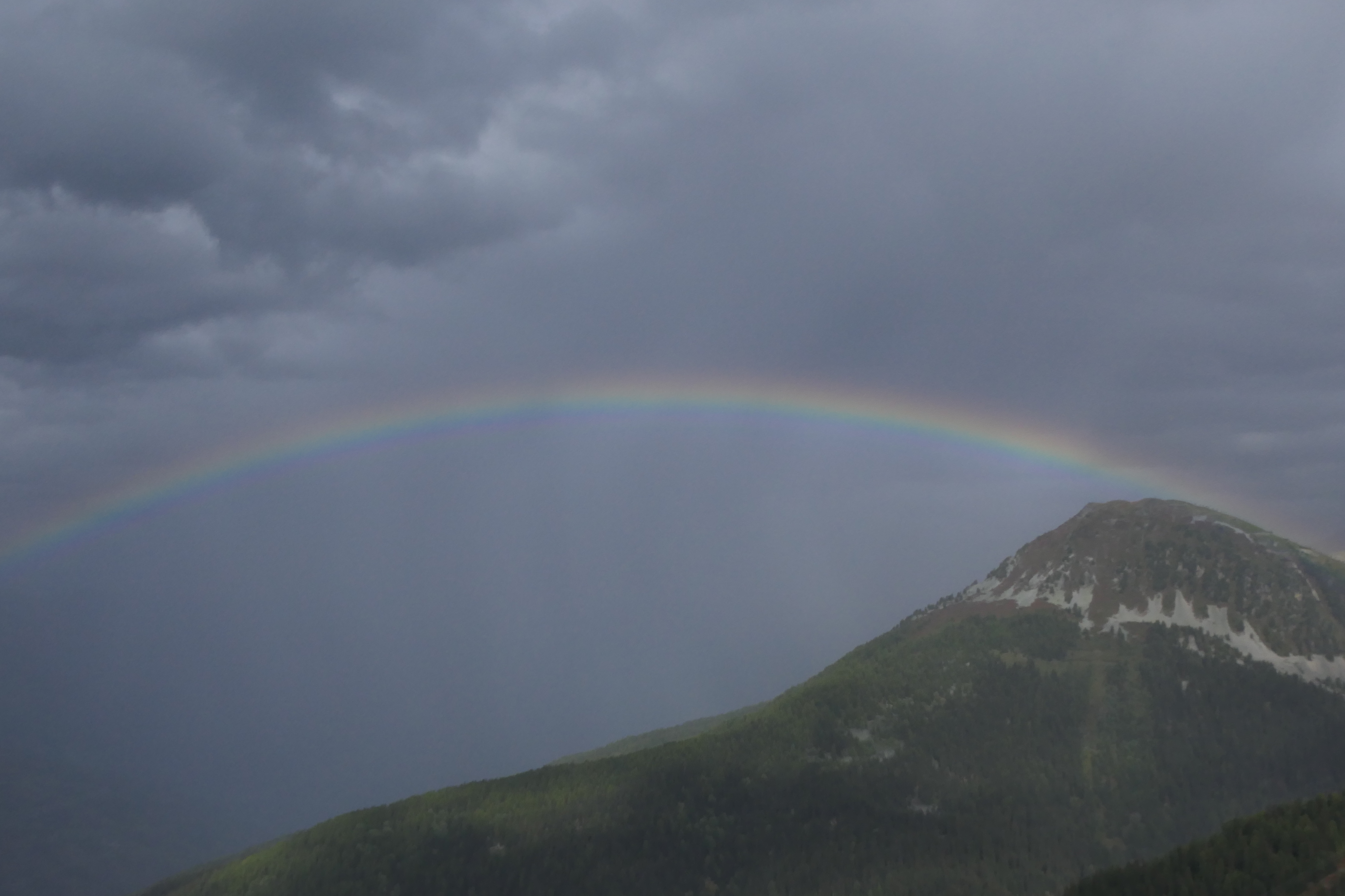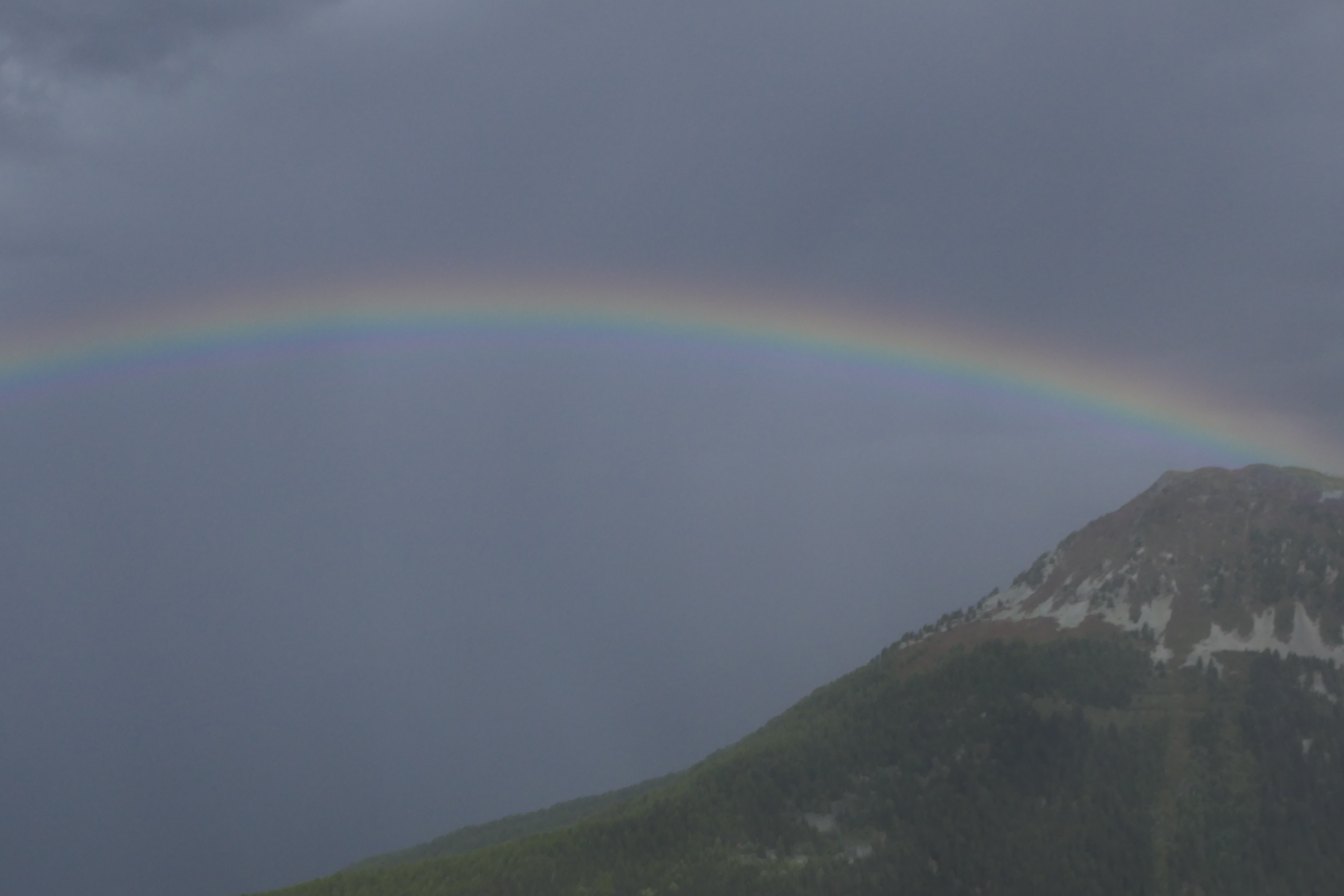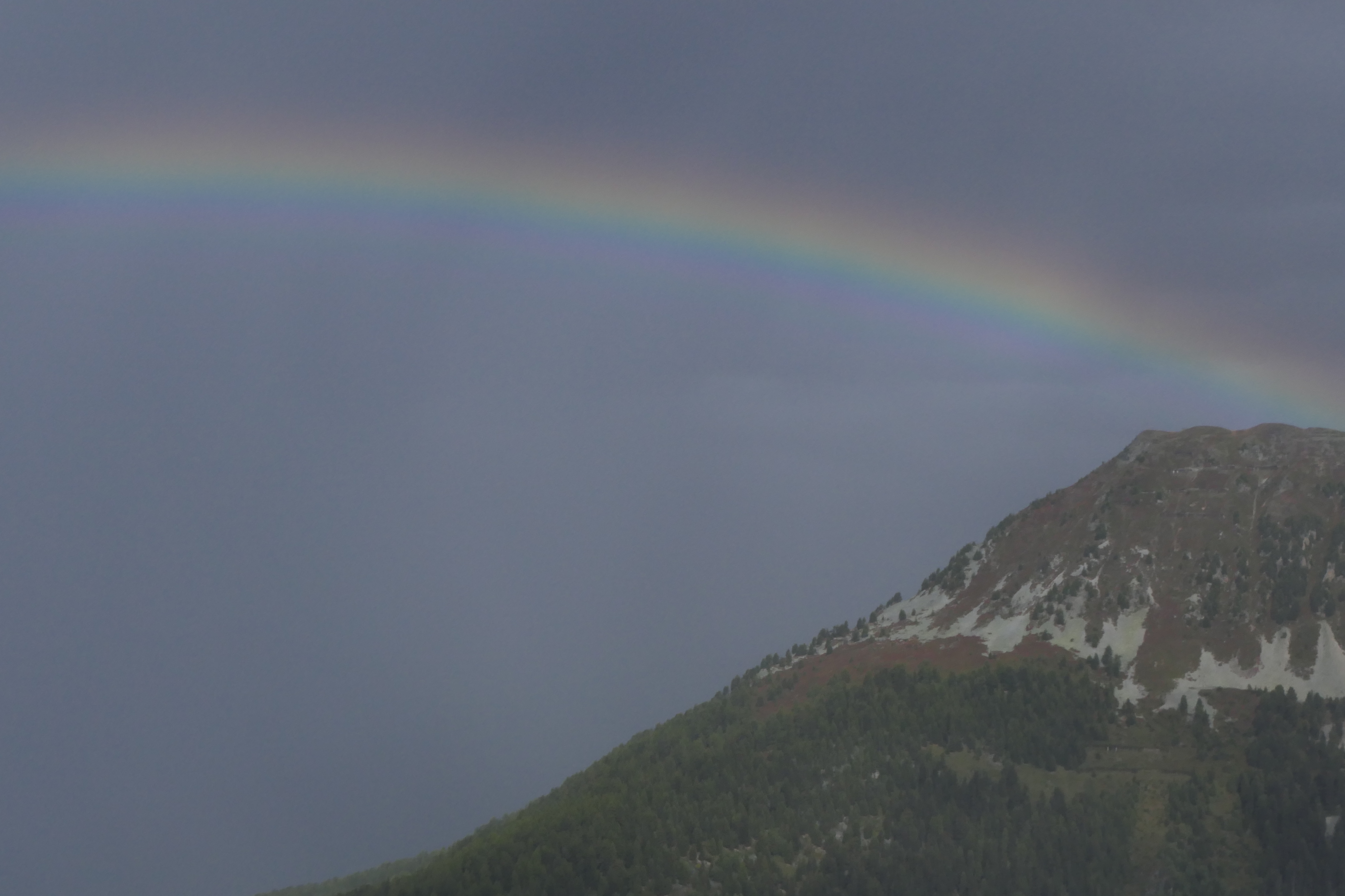 Then it was back to work, not writing R code very well (it comes and goes!) meanwhile the day outside darkened and the idea of sunbathing while having lunch disappeared. However, at one point I looked round the monitor to catch a rainbow, so here it is. Happy hunting for the pot of gold, I think it’s near Plagne Village!
