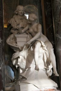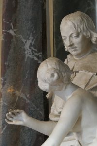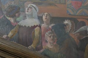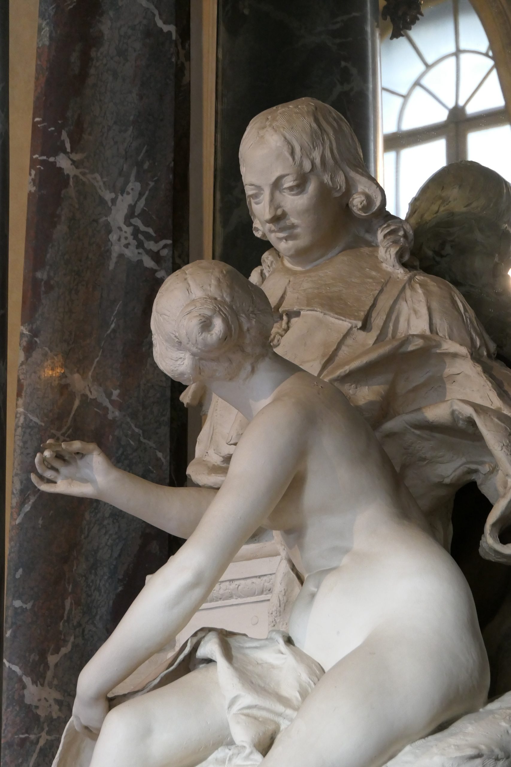 Is that man punting in the nude? What is going on here? Are the ladies looking heavenwards with the same question? Oh, how could I have forgotten? Just before the staircase on the left this chap (banished bishop of Toulouse?) who caught something of how I might have felt coming back past him having done the full tour …