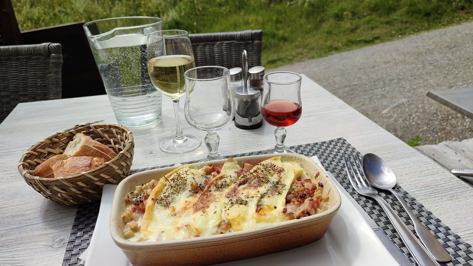 I ordered the wine (really splashing out) but the kir was free. The food is tartiflette: very much a Savoie staple of cheese sauce on potatoes with lardons and strips of reblochon cheese on the top. Very much food for hard working labourers. I confess I was too happily replete to work after that for several hours.
