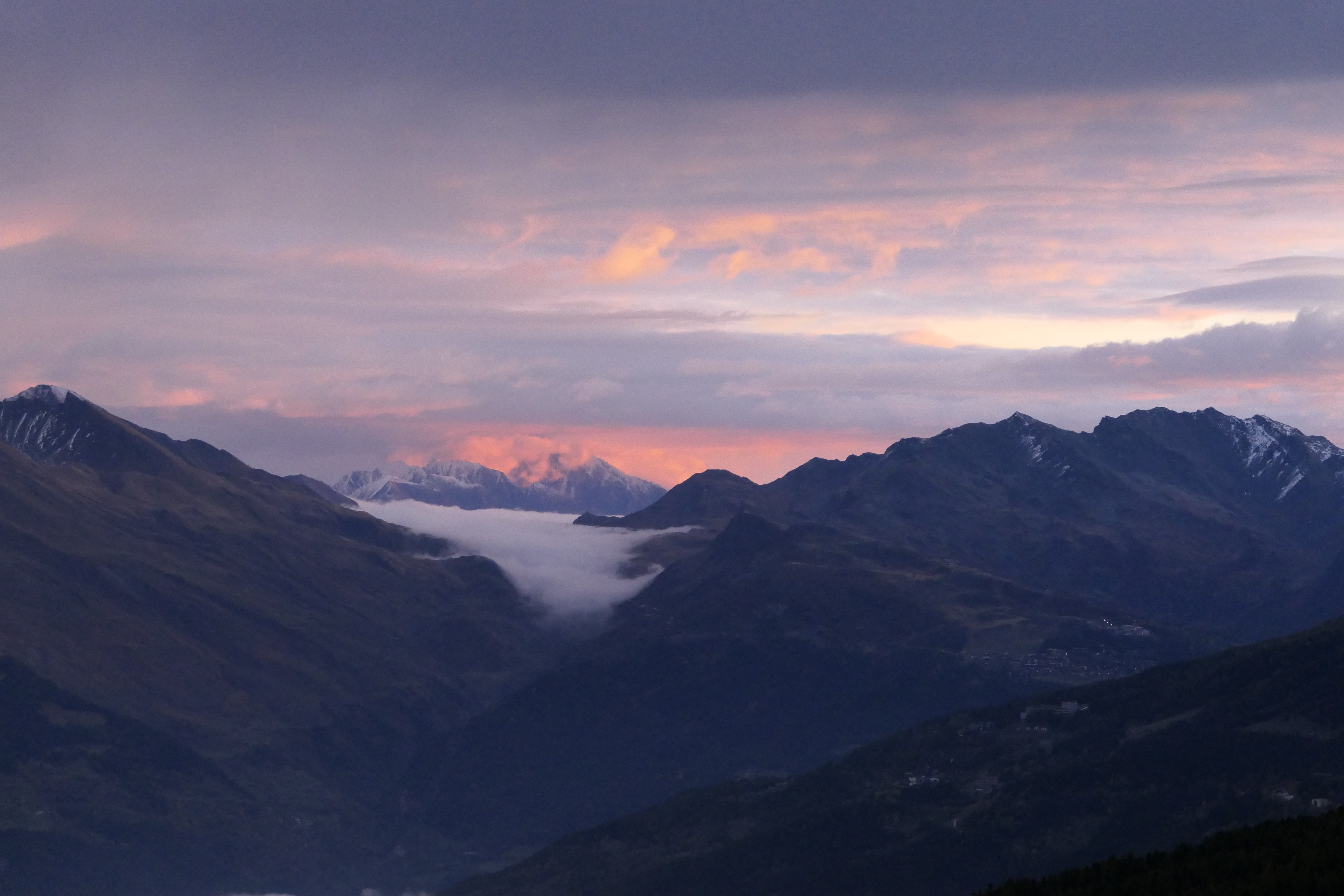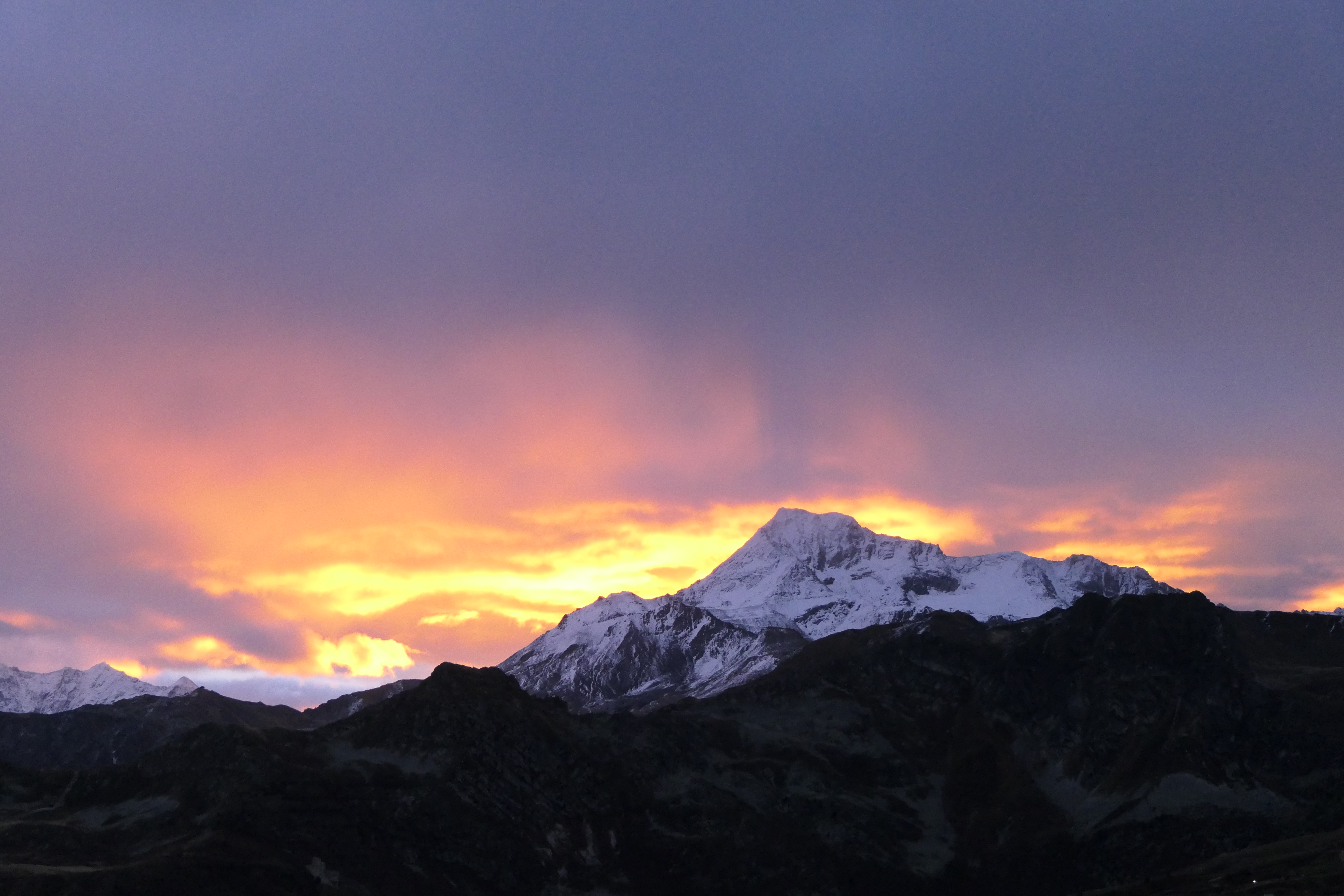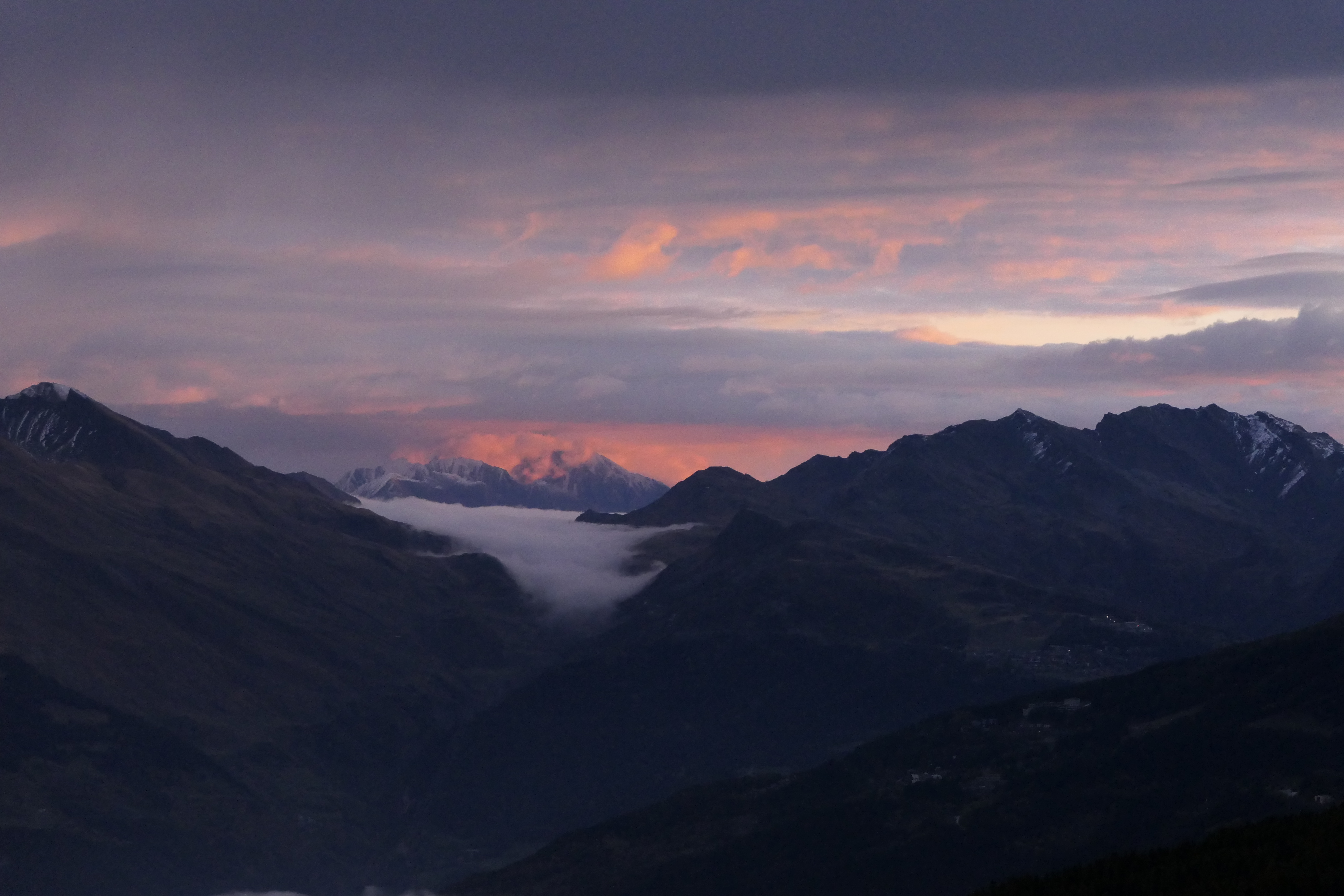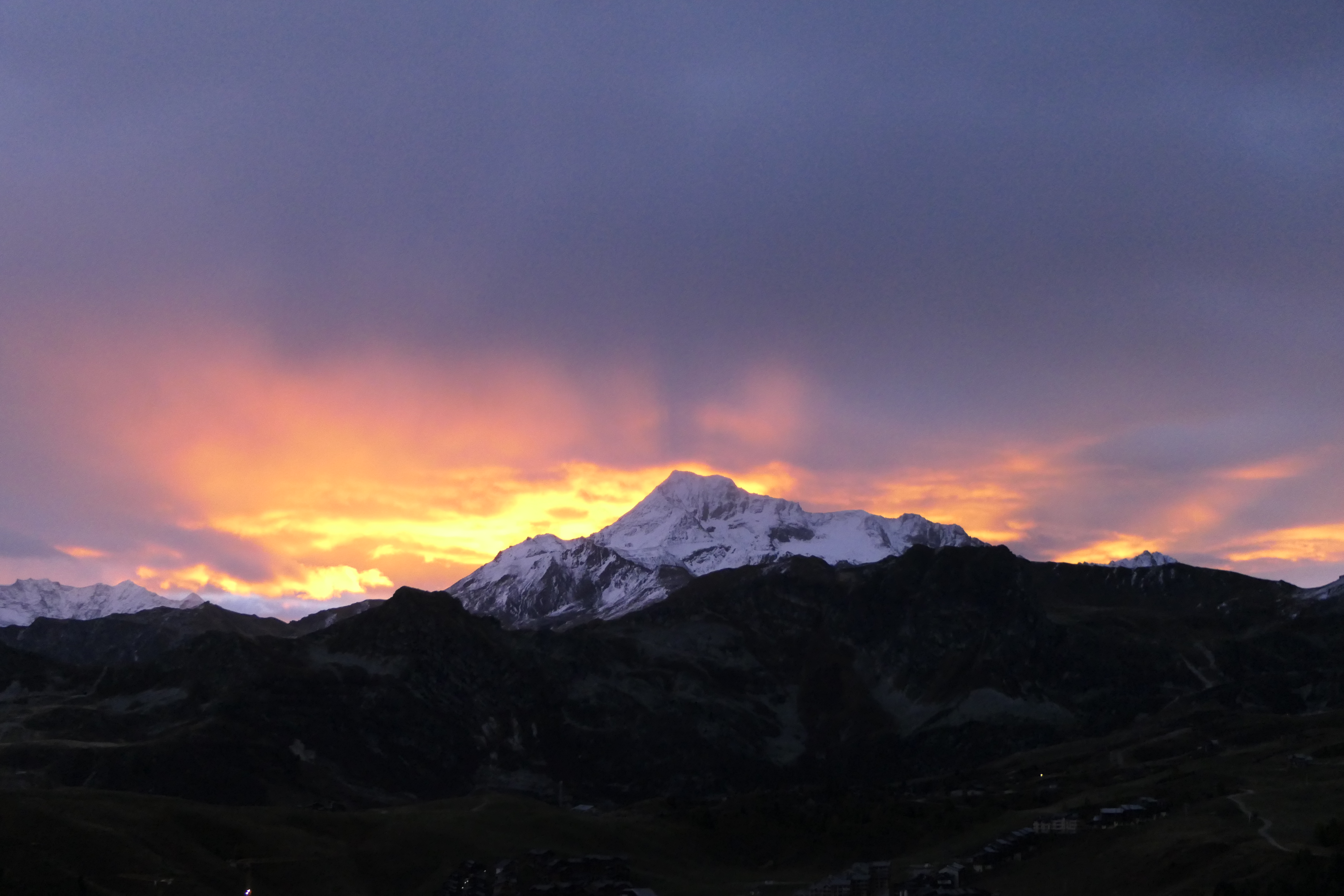 I was working yesterday morning. It had been a lovely dawn but not that unusual but something caught my eye and I looked up to see an amazing rich salmon pink was colouring a set of clouds beyond Grand Assaly ahead. I grabbed the camera and shot out onto the terrace but already the colour there had faded markedly, however, the sun exploding above the summit of Bellecôte and its little glacier was extraordinary.
