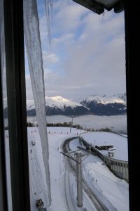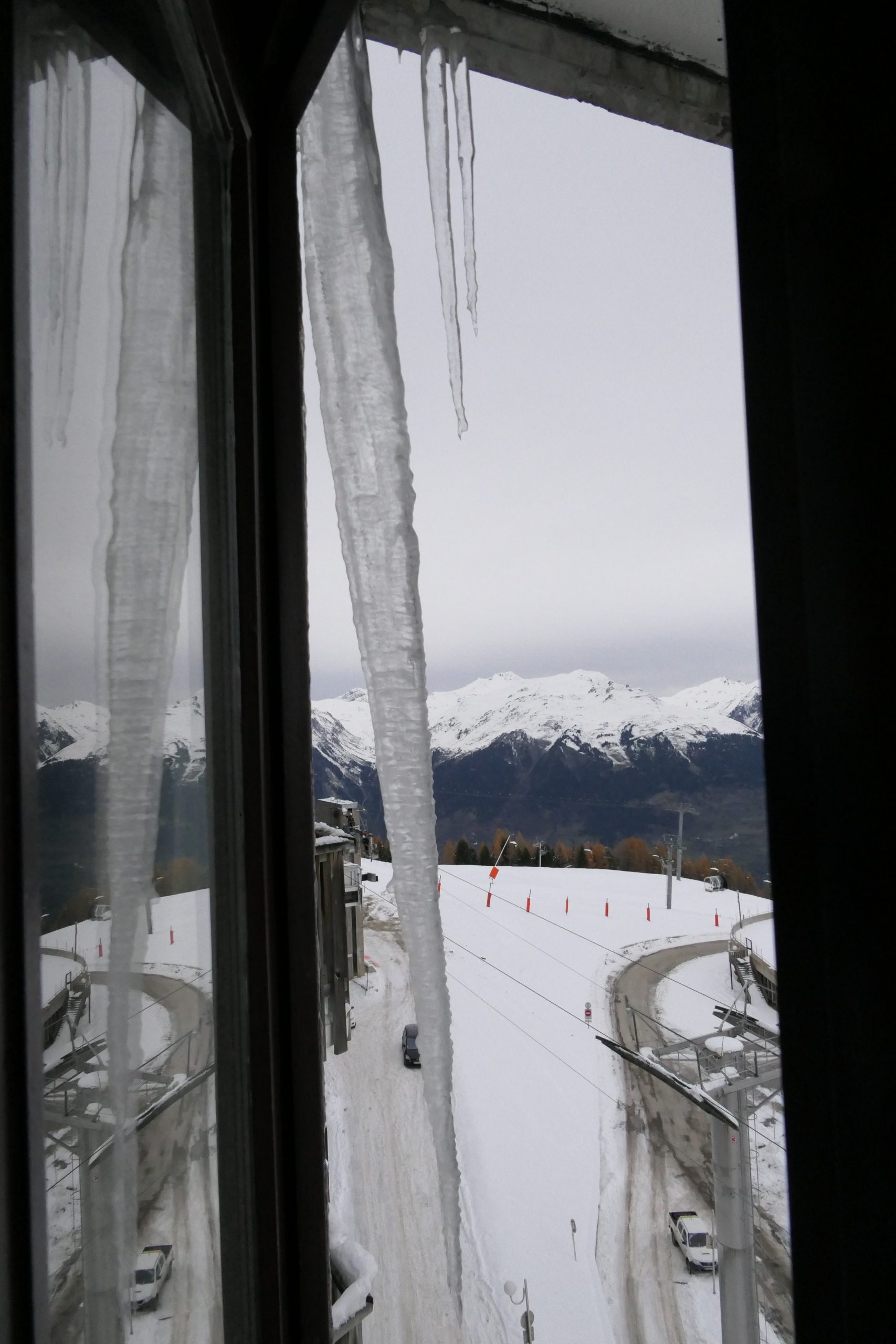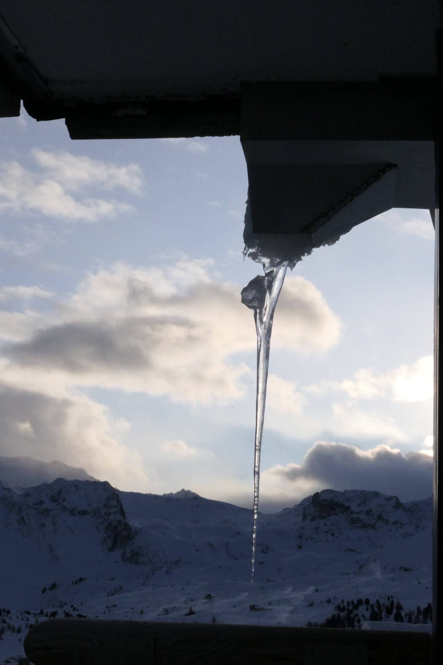 Has this got anything to do with icicles? Perhaps only to me but there should be a nice little one at the head of the post. That’s to the right of my main window here, at the other side I currently have three icicles: two small ones like that one on the right, and a huge one! The huge one is over a week old now and I’ve watched it grow and reshape day by day and it’s been my very simple thermometer: if it’s dripping then the air temperature is above zero, if it isn’t, then the air temperature is below zero. OK, it’s a pretty limited thermometer but I suspect it’s really pretty valid and sensitive around that zero point. Better than just a thermometer, it’s also been gentle entertainment: it’s mostly grown, day on day, but it’s reshaped far more than I would have imagined. It’s now between five feet and two metres in length and must weigh a bit. I think if this were the ski season the gardiens would have bene round looking for monsters like that on the other side of the window as this thing could certainly kill if it fell eleven stories. However, it’s on the safe side of the window: it would take an amazing wind to get it to clear the balcony of the apartment below (and there’s no-one there currently).
