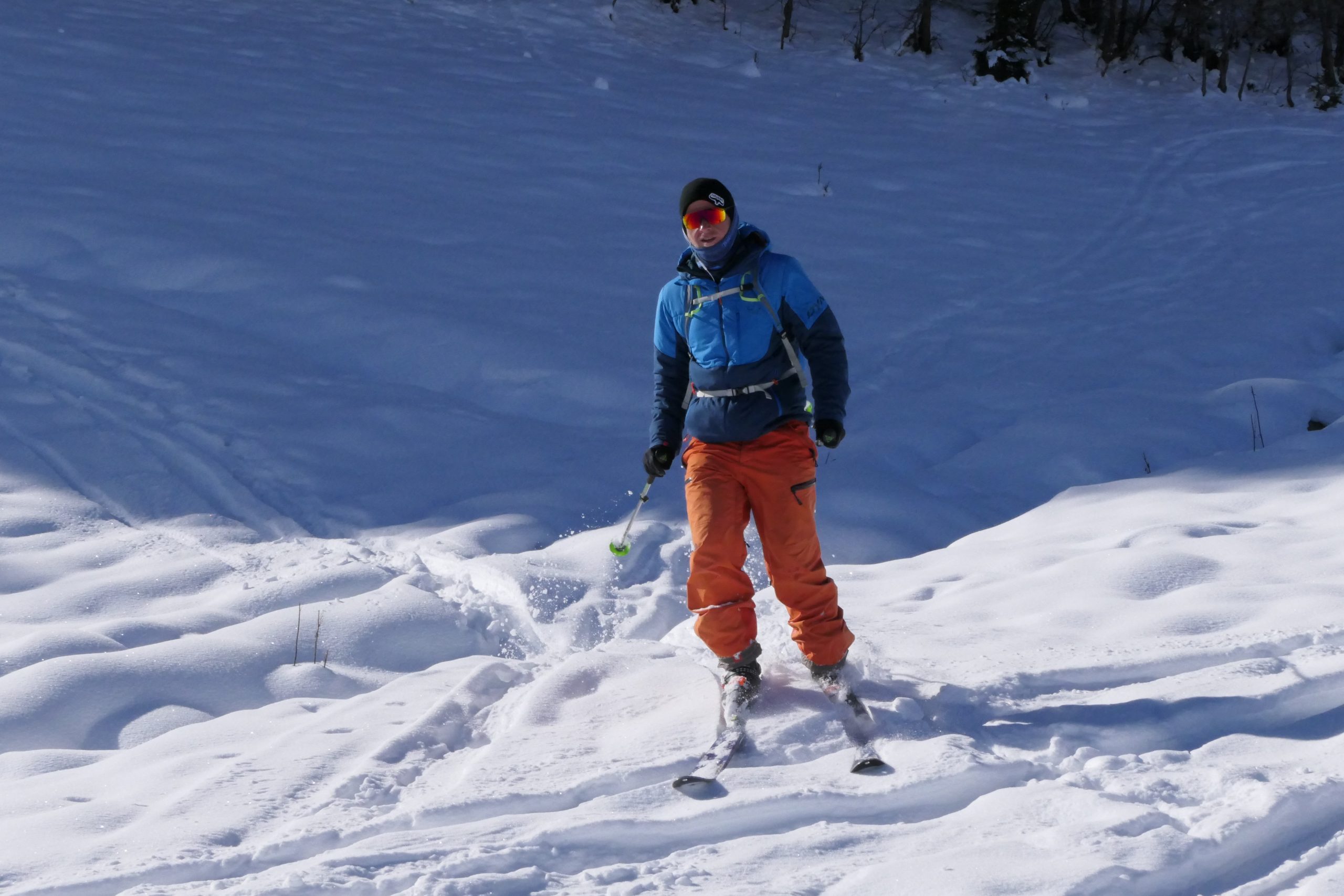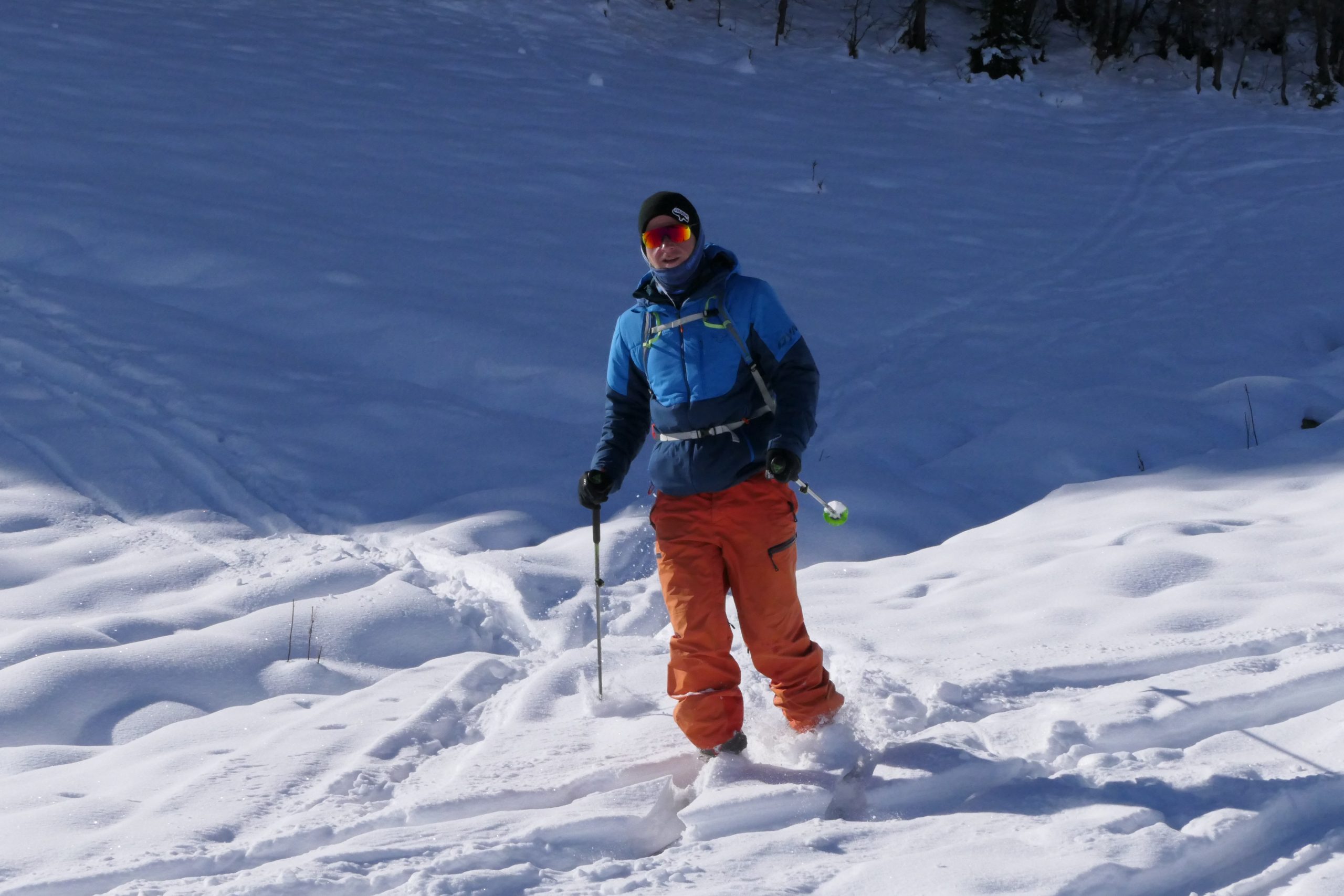 [OK, I give up on getting the o with the circumflex in there!] … and this just behind me, the skier had dropped down round the end of that bunch of trees on the right crossing my path up the slope there.