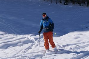 I think he’s got the downhill skis with skins or the toothed surface that allows you to ski (laboriously) upwards as if you had cross-country skis. I walked on for a bit, finding it hard going, a bit like walking up a sand dune as many steps, if I didn’t choose the best packed, hardest piste bashed snow, sank in up to an inch. Funny how much that slows you down and sucks energy. Then who should emerge off piste between that main slalom piste and the minor run into Plagne Centre that I was labouring up. As usual, click on them to get the full image.